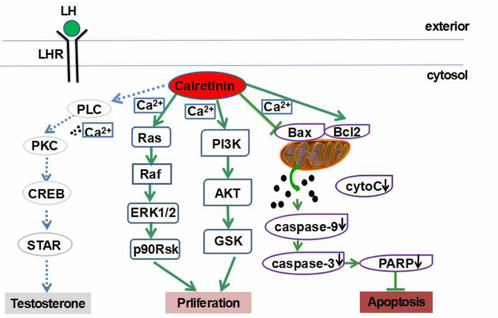 In conclusion, calretinin increases the viability and proliferation of Leydig cells possibly via activating the ERK1/2 and AKT pathways and suppresses cell apoptosis possibly via inhibiting the mitochondrial-related apoptotic pathway. These findings contribute to a better understanding of the pathophysiology of LOH. Calretinin, a Ca2+-binding protein, plays multiple protective roles in Leydig cells, suggesting that calretinin is a potential target for further studies to explore new therapies for LOH.