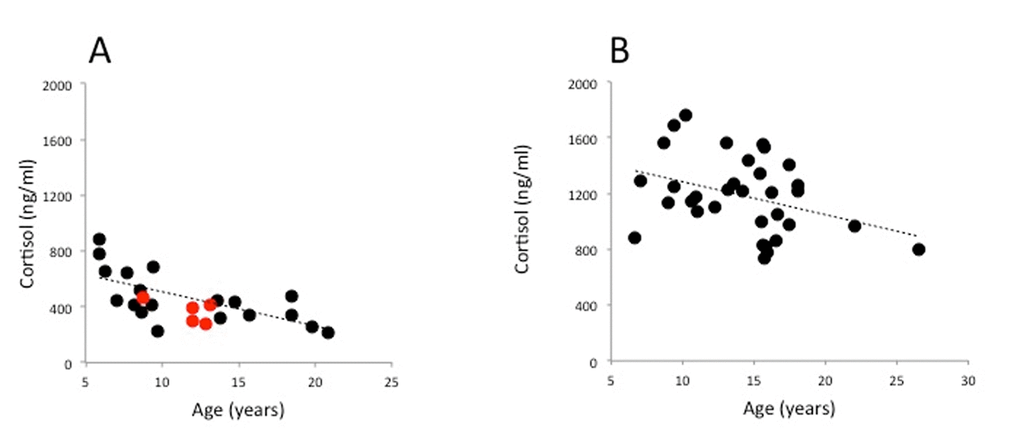 Several possibilities could be proposed for the differences in absolute cortisol values between our studies and those in the Oklahoma primate center– among them are assay differences, prior life experiences including developmental programming, housing conditions, environmentally induced phenotype differences, and past health history of the subjects studied. These possibilities remain to be evaluated but the remarkable similarity in the linear decrease in cortisol with age remains.