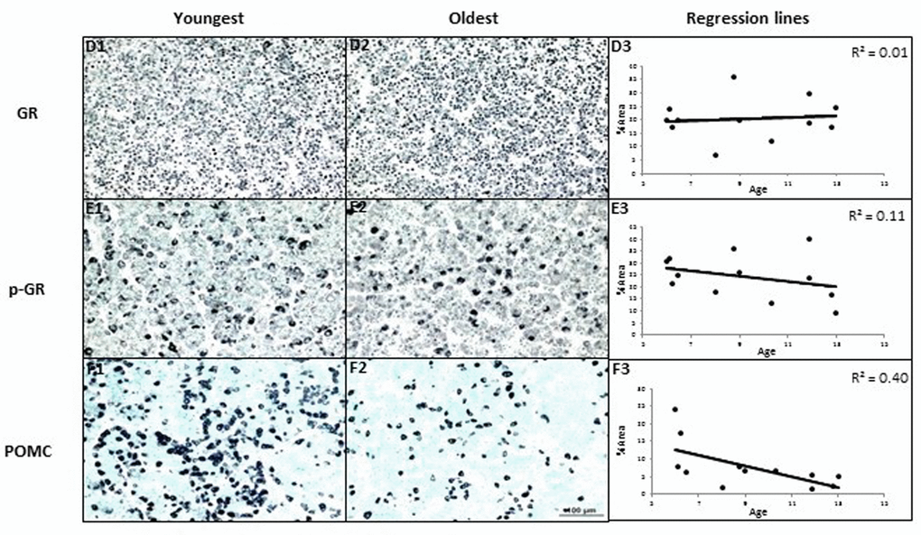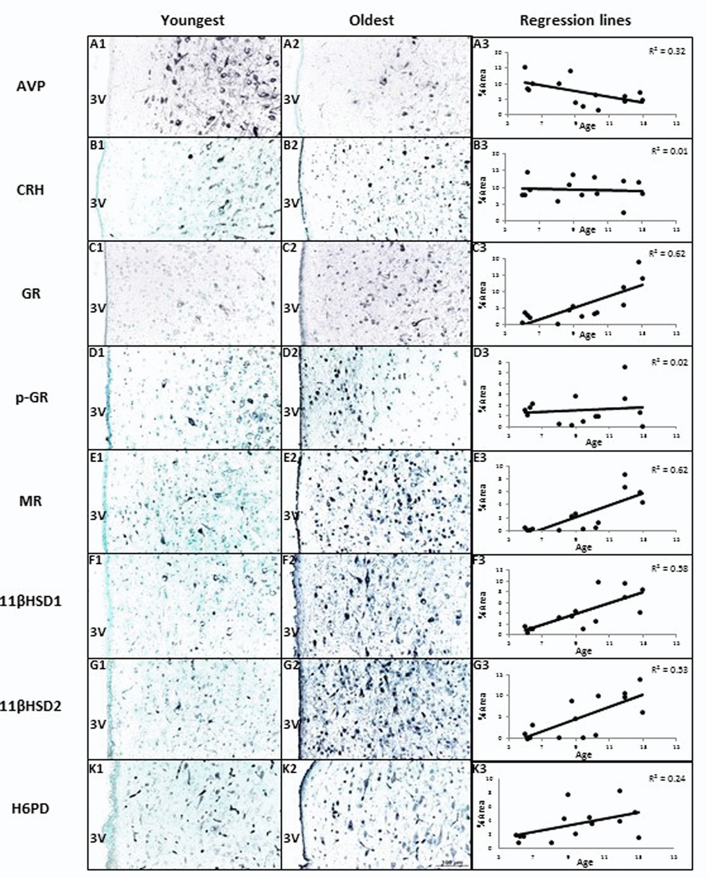 Systemically administered glucocorticoids inhibit AVP and CRH [30]. To our knowledge this study is the first to investigate a potential role of age-related alterations in the drive (AVP, CRH, and POMC) as well as negative feedback (GR and MR) in the PVN and pituitary. The observations that GR and MR increased with age as well as 11βHSD1 are all in keeping with our hypothesis that increased central negative feedback occurred with aging.