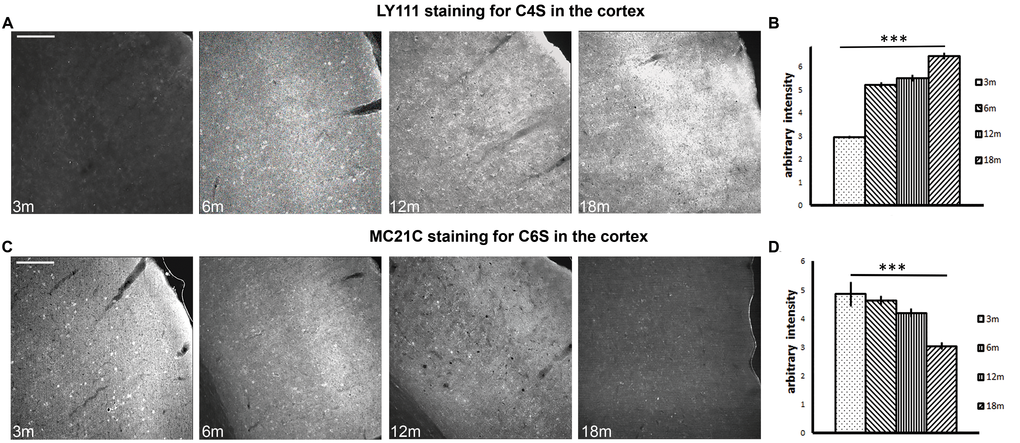 The staining intensity of brain sections was quantified by densitometry, with measurements taken from the auditory, visual and motor cortices. Staining intensity of C4S increased with age in the auditory cortex (representative images are shown in Fig. 1A), in the visual cortex, and in the motor cortex. Measurement of staining intensity in these areas showed a significant increase in C4S with ageing (Fig. 1B. 3m: 2.943 ± 0.069; 6m: 5.203 ± 0.118; 12m: 5.507± 0.147; 18m: 6.459± 0.138; Kruskal Wallis: p < 0.001. Data are averages of all the cortical areas analyzed). Conversely, the staining intensity of C6S decreased with age in the auditory cortex (representative images are shown in Fig. 1C), in the visual cortex, and in the motor cortex. Statistics done on cumulative averages of the areas showed a significant decrease in staining intensity (Fig. 1D. 3m = 4.848 ± 0.438; 6m = 4.628± 0.163; 12m = 4.186± 0.150; 18m = 3.034 ± 0.124; Kruskal Wallis: p < 0.001. Data are averages of all the cortical areas analyzed). This experiment suggests that the overall level of C4S increases in several brain regions during ageing, whereas C6S decreases.