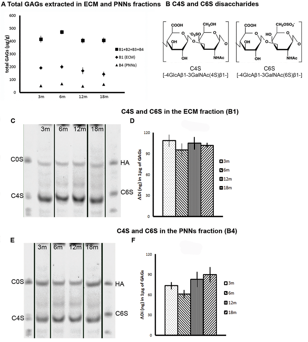 Graphs show mean ± s.e.m. *** indicates a significant relationship between the considered CS GAGs and time by One Way Anova, p >0.001.** indicates a significant relationship between the considered ratio and time by Kruskal-Wallis test, p =0.002.B1, ECM fraction; B4, PNNs fraction; B1+B2+B3+B4, sum of GAGs from the four fractions of each brain; 3m, 3-month-old brains; 6m, 6-month-old brains; 12m, 12-month-old brains; 18m, 18-month-old brains; C4S, Chondroitin-4-sulfate; C6S, Chondroitin-6-sulfate; C0S, Chondroitin non-sulfated; HA, hyaluronic acid.
