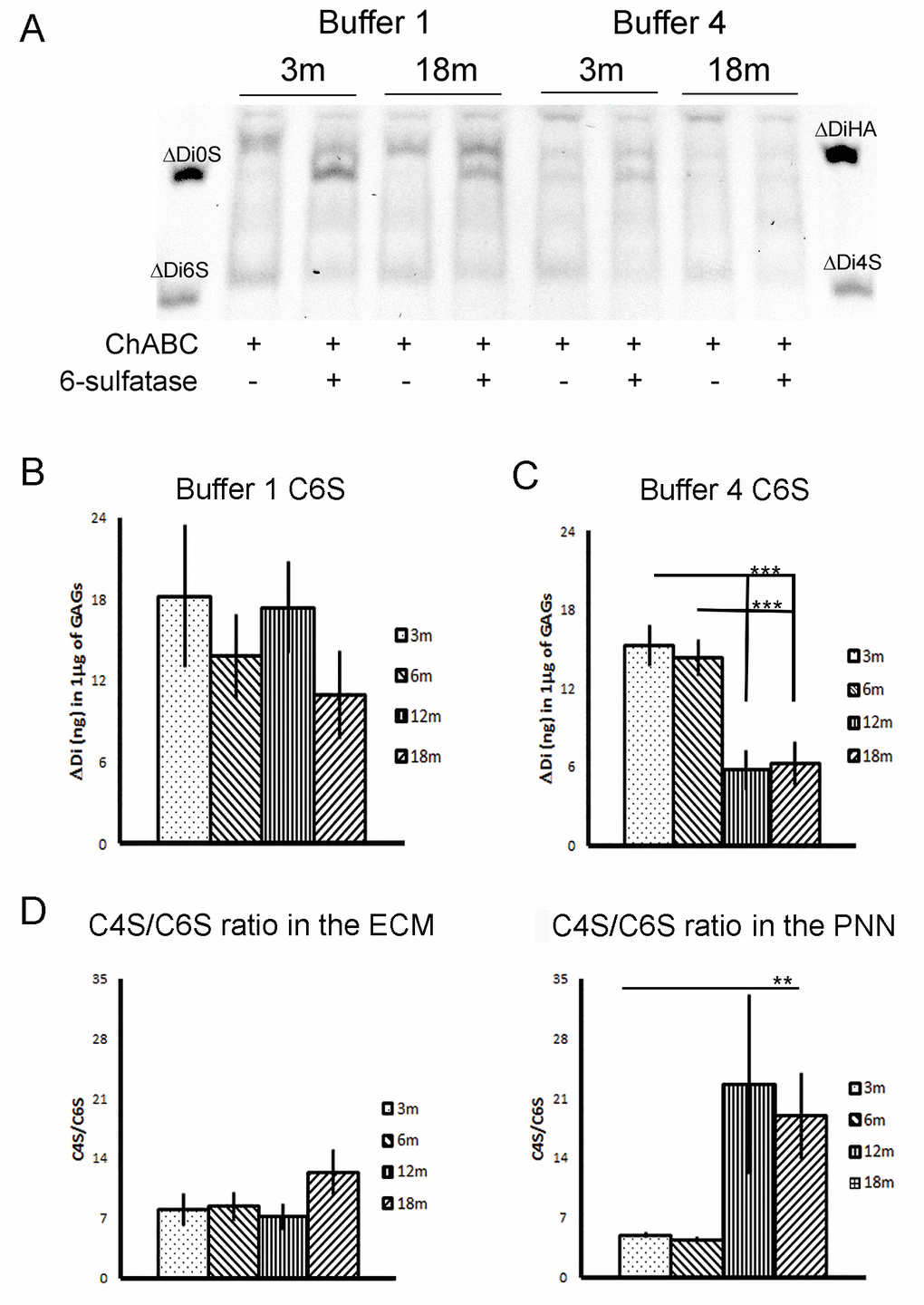In conclusion, the biochemical results from glycan analysis show that the relative quantities of mono-sulfated disaccharides change in favor of the inhibitory C4S upon ageing, mainly due to a decrease in C6S at 12 and 18 months, and this change occurs specifically in the PNNs fraction. This change may make aged PNNs more inhibitory.