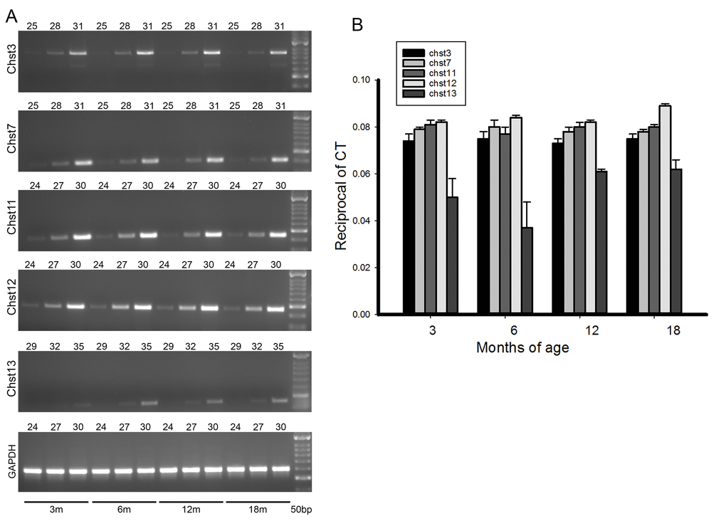 | Chst12 (CS4ST2) | (F) 5’-TGGGAGGAAGACTGGTTTGC-3’ (R) 5’-AGGTGCTTGGGTTGTGTCAT-3’ | 24-27-30 | 259 |