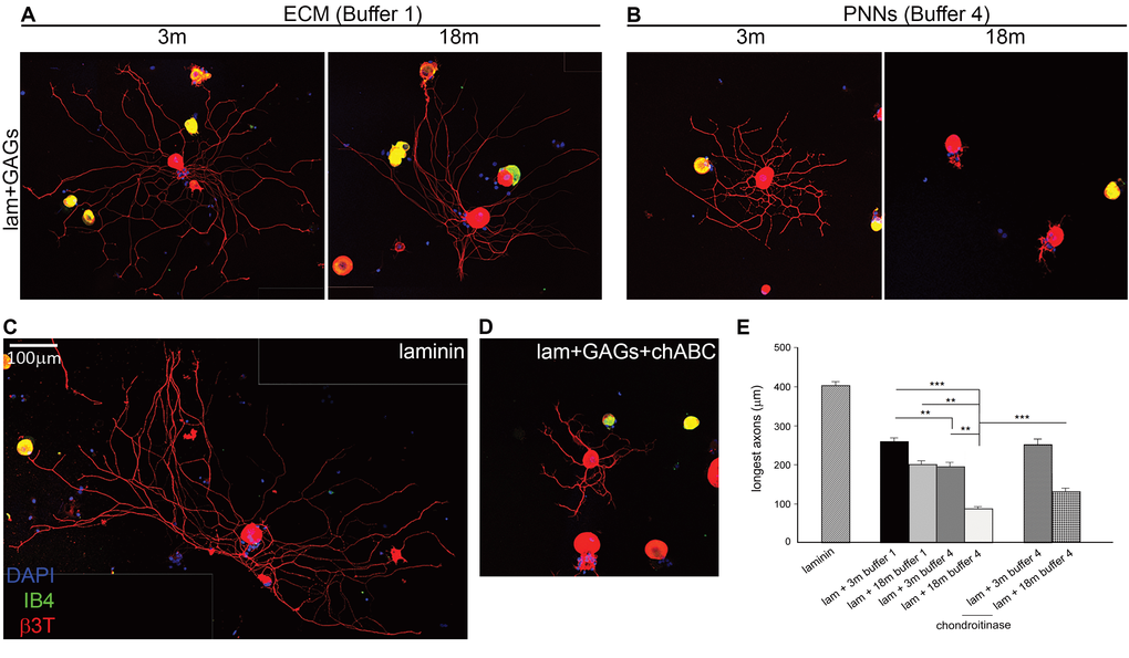 Different experimental conditions tested were: laminin alone, ECM extracts (B1 GAGs) from 3 m rats and 18 m rats, PNNs extracts (B4 GAGs) from 3 m rats and 18 m rats.