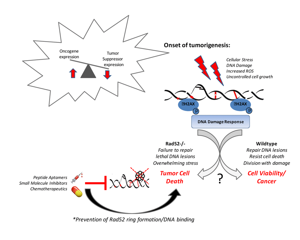 Unlike in a healthy system, the biological environment surrounding tumorigenesis is one of high genotoxic stress. In order for tumor cells to remain viable not only in their area of primary induction, but also for metastasis and re-colonization, a functional DDR needs to maintain a threshold level of genomic integrity within the cell and may also be a prerequisite for tumor cells to survive. Also, because DNA repair mechanisms are modulated in tumor cells to promote survival under genotoxic stress, tumor environments can be more sensitive to inhibition of such DNA repair systems that they have come to be so heavily reliant on. Inhibiting tumor-specific DSB repair pathways, such as those involving RAD52, may function by amplifying DNA damage, overloading the cancer cell with genomic instability to the point where it can no longer thrive [30]. Thus, the manipulation of DNA repair pathways in cancer may play a key role in promoting tumorigenesis and progression by maintaining genomic stability within tumor cells and actually enhancing their survival [53].