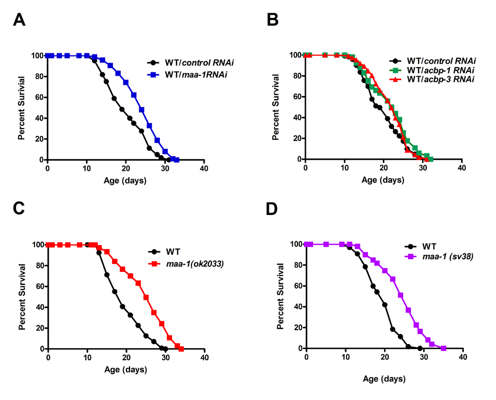 An earlier study failed to show any extension of lifespan in a few ACBP null mutants of C. elegans [13]. Since complete loss of ACBP causes growth defects in yeast, we reasoned that a reduction, rather than a total loss, of gene function might reveal a contribution of ACBP to lifespan in C. elegans. To address this, we used dsRNA-mediated RNAi to individually down-regulate each of the seven ACBP genes. Indeed, the lifespan of wild-type worms was increased markedly by knockdown of maa-1 (Figure 1A; Table S1 and S2) and more modestly by knockdown of either acpb-1 or acbp-3 (Figure 1B; Table S1). We confirmed the effect of maa-1 deficiency on longevity using two maa-1 deletion mutants (ok2033 and sv38) (Figure 1C,D and Figure S1). Only the sv38 allele had previously been established to be null [14]; however, both mutants showed similar survival curves, suggesting that maa-1(ok2033) may also be a null allele (Figure 1C,D; Table S1 and S2). Given that manipulation of maa-1 expression has the most marked effects on C. elegans lifespan, we focused our further analyses on this ACBP paralog.