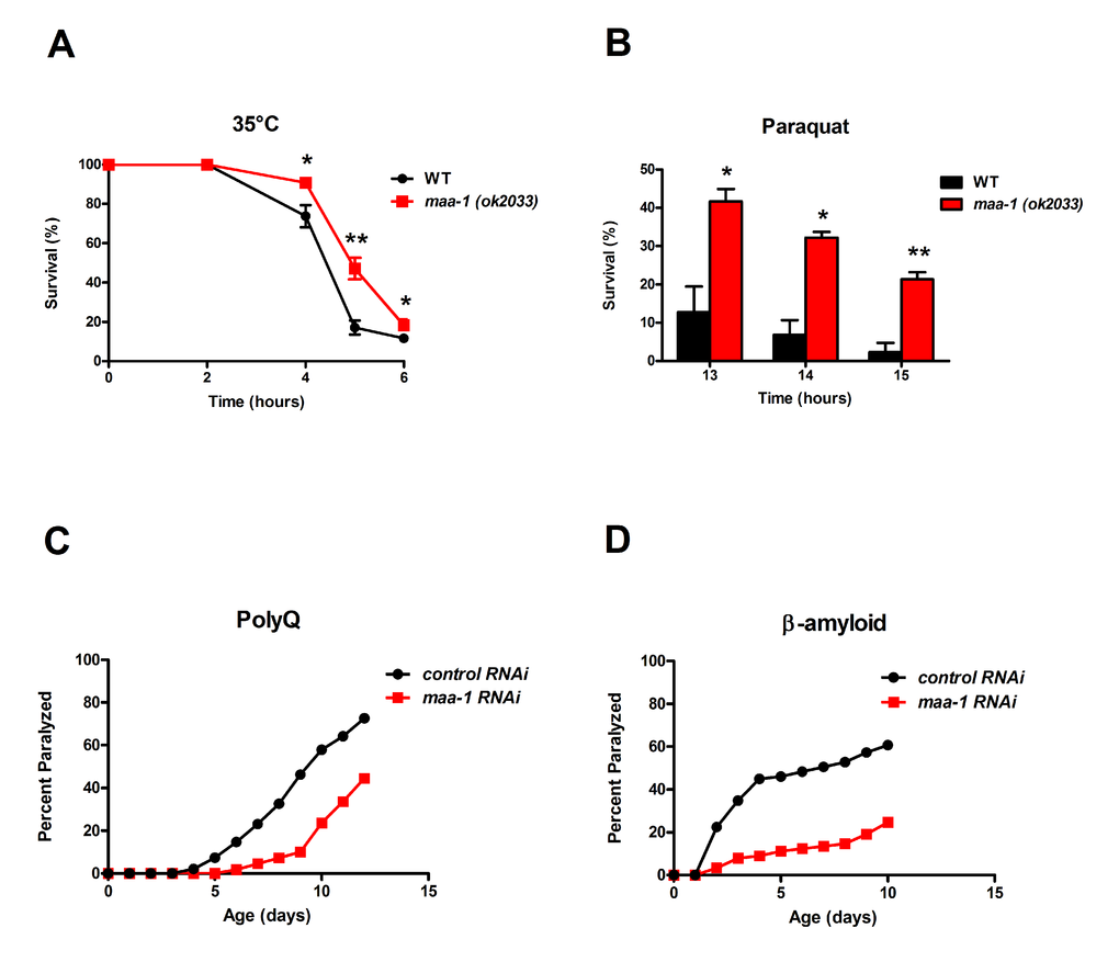 Several lifespan-extending mutations, including deletion of ACB1 in yeast, concomitantly increase resistance to various forms of stress [1]. Consistent with this, we found that maa-1 (ok2033) mutants were more resistant than wild-type animals to both thermal stress induced by incubation at 35°C and oxidative stress induced by the superoxide generator paraquat (Figure 2A,B). Stress induced by protein misfolding and aggregation is thought to contribute to the aging process in many species, and elevated resistance to such proteotoxicity is another feature common to many long-lived C. elegans mutants [21]. Several transgenic models of proteotoxicity have been developed in C. elegans, two of which are expression of polyglutamine repeats fused to YFP (Q35YFP) or human β-amyloid peptide (Aß1-42) in the body wall muscle. In these animals, the effect of proteotoxic stress is conveniently measured as age-dependent paralysis [22,23]. We found that in both of these models, loss of motility was significantly delayed by maa-1 RNAi (Figures 2C,D and Figure S2A,B), suggesting that loss of MAA-1 activity counteracts the age-associated disruption of proteostasis. Collectively, these data indicate a novel role for MAA-1 in stress resistance and longevity in C. elegans.