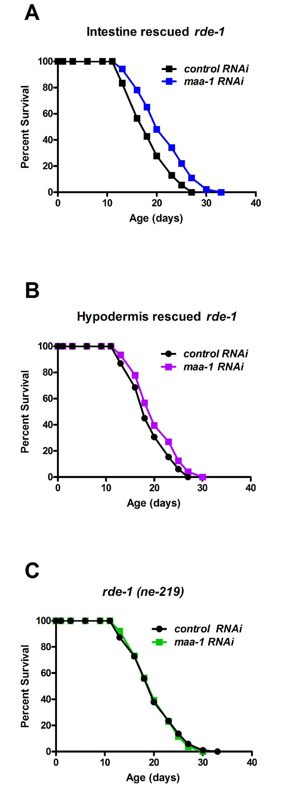 Previous studies of C. elegans lines expressing a MAA-1::GFP fusion protein have shown that MAA-1 is highly expressed in intestinal and hypodermal cells, but is essentially undetectable elsewhere [14]. To identify the tissue(s) in which MAA-1 functions to regulate lifespan, we performed tissue-specific RNAi. RDE-1 is an essential component of the RNAi machinery and inactivation abolishes the RNAi response in all tissues. Re-expressing rde-1(+) under the control of a tissue-specific promoter therefore allows the effects of RNAi to be examined specifically in that tissue. To reduce maa-1 expression exclusively in the intestine or hypodermis, we used rde-1(ne129) mutants in which rde-1(+) had been restored using the elt-2 (intestine) and lin-26 (hypodermis) promoters (R. Roy, unpublished results and [24]). rde-1(ne129) mutants, in which RNAi is inactivated ubiquitously, were used as control animals. Down-regulation of maa-1 in the intestine resulted in a highly significant longevity extension (Figure 3A; Table S1 and S2). Conversely, the hypodermal down-regulation of maa-1 had only a minor effect on longevity (Figure 3B) and, as expected, maa-1 RNAi had no effect on the lifespan of the unrescued rde-1(ne129) mutants (Figure 3C; Table S1). To further substantiate the modest response to hypodermal down-regulation of maa-1, we used an alternative transgenic animal in which the wrt-2 promoter was used to rescue the rde-1(+) function exclusively in the hypodermis [25]. The results were consistent with those obtained with the lin-26p::rde-1 transgenic line (Figure S3, Table S1 and S2). Together, these results suggest that MAA-1 functions to modulate aging predominantly in the intestine and to a much lesser extent in the hypodermis.