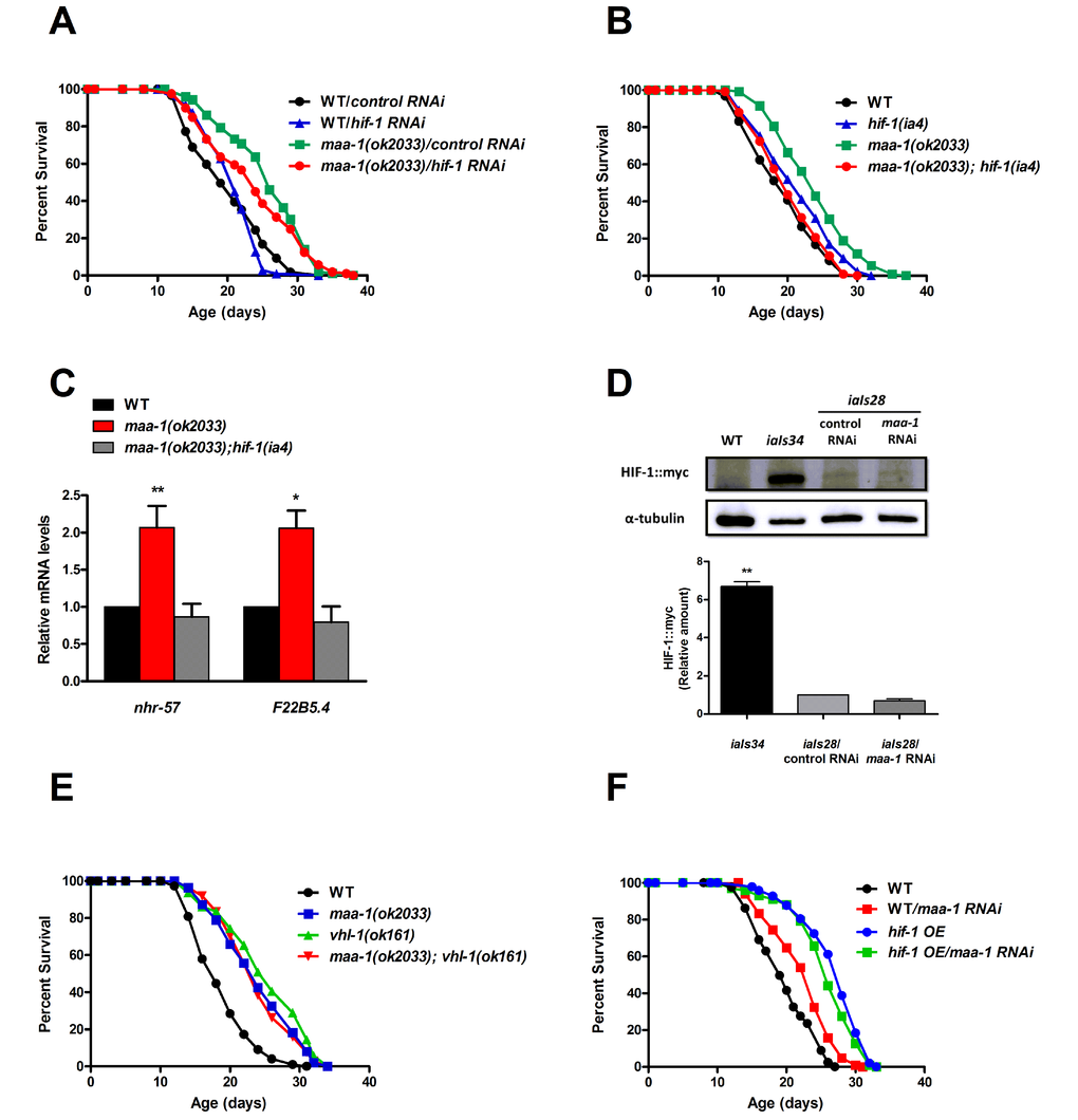 Overall, these results suggest a requirement for HIF-1 transcriptional activity in extending the lifespan of the maa-1 (ok2033) via mechanisms independent of both HIF-1 stability and fmo-2 expression.