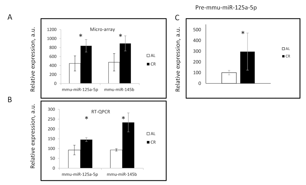 To secondary validate the microarray data, we used TaqMan MicroRNA assay to determine miRNAs expression. We selected two miRNAs: mmu-miR-125a-5p, and mmu-miR-145b (miR-145b) which were found to be significantly affected by CR (Figure 1A). Results of the qPCR analysis are presented in (Figure 1B). The expressions of mature miR-125a-5p and miR-145b were significantly higher in the CR group similar to the microarray data (Figure 1 A & B).
