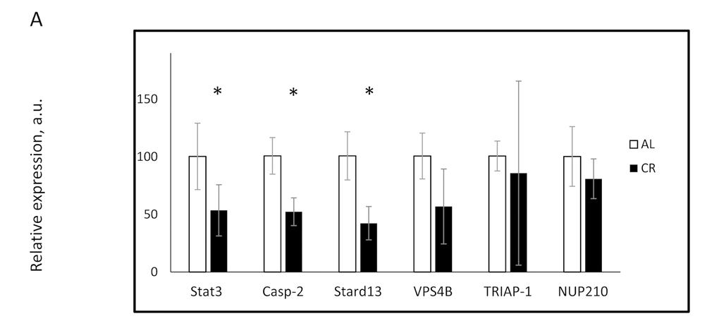 To study the possible physiological consequence of changes in miR-125a-5p expression, we analyzed the effect of CR on its downstream targets. Stat3 and Casp2 were previously reported as targets of miR-125a-5p [32,38]; using bioinformatics we predicted 4 additional targets: Nup210, Stard13, Triap1,and Vps4b. Details of the seeding sequence and target sites on the 3'UTR of identified targets are presented in Supplementary Table S2. Three targets: Stat3, Casp2, and Stard13 demonstrated significant downregulation at the mRNA level in CR samples compared with AL (Figure 2). These results were in inverse correlation with the data on the upregulation of miR-125a-5p in our study. The expression of Nup210, Triap1, and Vps4b genes did not show any statistically significant changes upon CR. Thus, CR induced expression of miRNA caused appropriate changes in the expression of some of its target genes suggesting the potential physiological significance of the regulation of miR-125a-5p expression in response to CR.