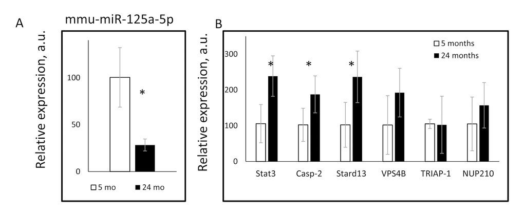 In this study, we investigated the changes in the expression of miRNAs in the liver of mice subjected to a long-term (two years) calorie restriction. miRNA microarray analysis revealed 16 miRNAs with significant changes in their expression pattern upon CR. One of the miRNA, mmu-miR-125a-5p (miR-125a-5p), and its target genes such as Stat3, Casp2, and Stard13 demonstrated age-dependent changes, which were ameliorated by CR. Importantly, identified targets have been connected with aging-related signaling pathways. STAT3 is a transcriptional factor that plays a role in the insulin resistance [25], and Casp2 is a proteolytic enzyme, whose activity is upregulated upon aging [26].