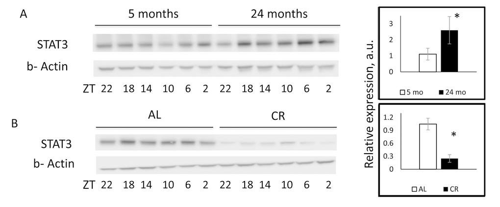 Effect of aging and CR on STAT3 expression and activity has been previously reported [48,49]. In one study, the increased STAT3 activation (nuclear translocation) in response to growth hormone stimulation has been observed in the liver slices from CR animals compare with slices from AL group, while no significant effect of aging or CR at the total level of STAT3 protein has been detected [48]. In another study, the increase in leptin-stimulated phosphorylation of STAT3 in the hypothalamus was observed in CR group and again no change in the total STAT3 protein level was observed [49]. In our study, we have demonstrated age-dependent upregulation of total STAT3 (Figure 4A) and amelioration of this upregulation upon long-term 30% CR (Figure 3). Together all these results suggest that the effect of diet and age on STAT3 is complicated and might be tissue and treatment specific.