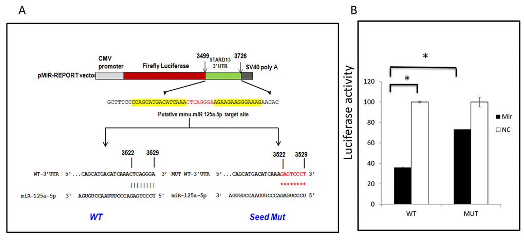 CHO-K1 cells were maintained in Dulbecco’s Modified Eagle’s Medium (DMEM: 5% FBS, 2 mM L-glutamine, 1 mM L-proline, 10 mM HEPES) in humidified 5% CO2 atmosphere at 37°C.For Wild-type (WT) reporter construct, 228bp of 3’UTR of Stard13 gene spanning putative site for mmu-miR-125a-5p was cloned downstream of firefly luciferase coding region in pMIR-REPORT vector (Ambion, Austin, TX). To generate the mutated construct (MUT), site-directed mutagenesis of the putative target was carried out in the WT-3’ UTR construct. Primers used for the cloning and mutagenesis are listed in the Table 2. CHO-K1 cells were plated in 24 well plate one day before the transfection. Cells were co-transfected with 100ng of WT-3’UTR or MUT-3’UTR firefly luciferase reporter construct, 0.5 ng of renilla luciferase reporter plasmid (Promega, Madison, WI) and with either miR-125a-5p mimic (GE lifesciences) or Negative control (NC) mimic (Ambion catalog# 4464058) in duplicates. Cell lysates were collected 48hours after transfection and assayed for luciferase activity using Dual-Luciferase Reporter Assay System (Promega) and Victor 3 Multilabel Counter 1420 (PerkinElmer). Renilla luciferase activity was used to normalize the firefly luciferase activity.