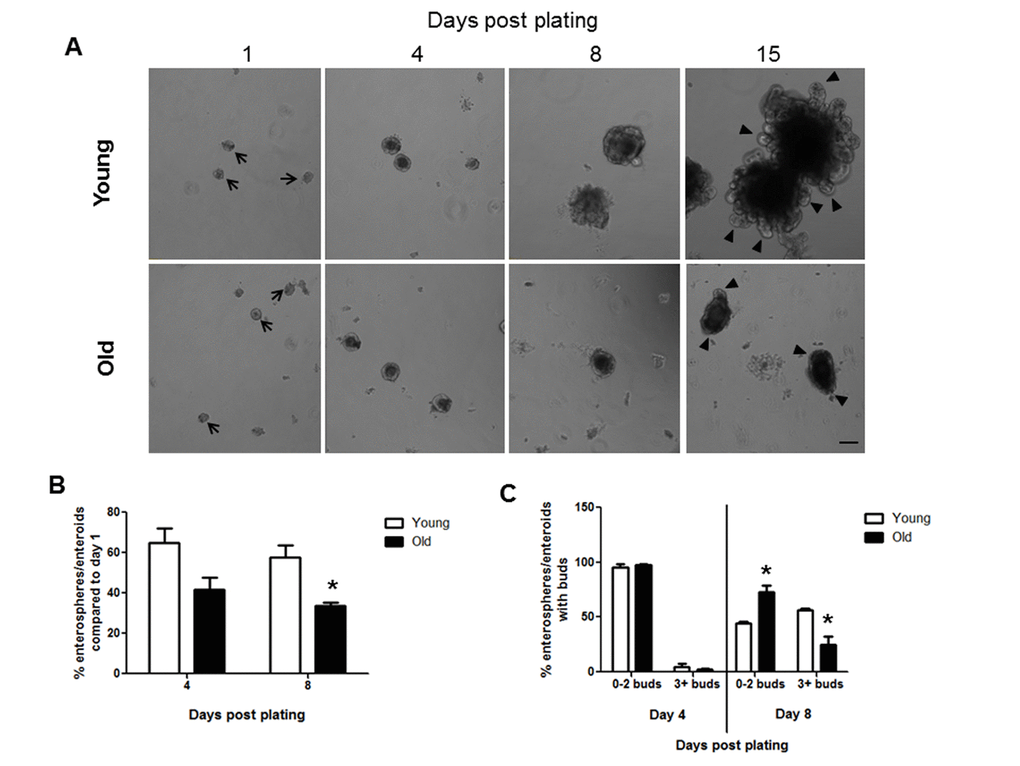 Crypt culture in a 3D matrigel system provides a useful and widely used system to assess IESC function [30]. Isolated intestinal crypts form round enterospheres that expand and differentiate to form more complex enteroids with bud structures after several days in culture [31]. Crypt culture revealed that intestinal crypts isolated from both young and old animals formed enterospheres in vitro on day 1 after plating (Figure 1A). Efficiency of crypt culture was calculated by dividing the number of enterospheres and enteroids present at day 4 or 8 by the number of enterospheres present on day 1 in each well. This provides a measurement of how many enterospheres initially plated were able to survive and grow in crypt culture conditions. Efficiency measurements revealed a trend for decreased enteroid survival in old vs. young at day 4 post plating and a significant decrease in enteroid survival in old animals at day 8 post plating (Figure 1B). Crypt-derived enteroids typically begin to show bud structures by 3-7 days post plating [31]. Each bud represents a crypt structure that containing stem and progenitor cells and the number of buds provide a surrogate for IESC function [32]. The numbers of buds per enteroid were counted at days 4 and 8 post plating, categorizing enteroids with 2 buds or fewer as less complex, and enteroids containing 3 or more buds as more complex. Following 4 days in culture there was no difference in the enteroid complexity between young and old (Figure 1C). By day 8 post plating, enteroids from old mice showed a decrease in complexity compared to those from young mice as significantly fewer enteroids from old animals contained 3 or more buds (Figure 1C). At 15 days post plating very complex enteroids had formed from the crypts derived from young mice, while the enteroids formed from old mice were much less complex (Figure 1A).