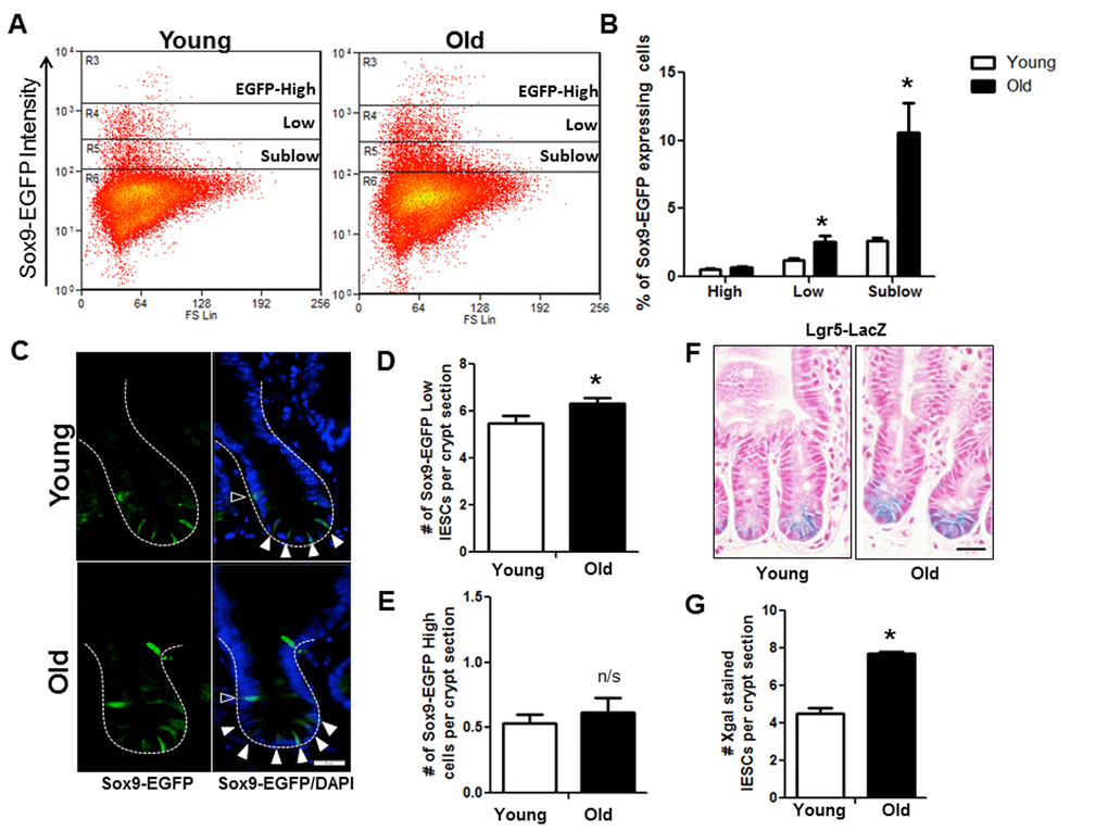 Flow cytometry on IEC isolated from Sox9-EGFP mice revealed significantly more IESC (Sox9-EGFPLow) and progenitor cells (Sox9-EGFPSublow) in old vs.to young (Figure 3A and 3B). However, the Sox9-EGFPHigh cell population that contains enteroendocrine cells (EECs) and a reserve stem cell population activatable upon injury and regeneration [25] did not differ between young and old mice (Figure 3A and 3B). Results were confirmed by EGFP immunofluorescence, which revealed no change in the number of Sox9-EGFPHigh cells per crypt in old vs. young (Figure 3C and 3E) but demonstrated a significant increase in the number of Sox9-EGFPLow IESC per crypt in old animals (Figure 3C and 3D). This was further confirmed in the Lgr5-LacZ IESC reporter mouse model [23] where expansion of Lgr5-LacZ IESC was observed in old vs. young (Figure 3F and 3G). Of note, using histology it is not possible to reliably quantify Sox9-EGFPSublow progenitor cells by EGFP immunofluorescence because the very low EGFP expression cannot be readily distinguished from background.