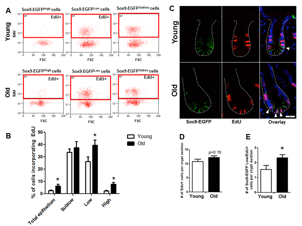 Flow cytometry of dissociated jejunal IEC from young and old Sox9-EGFP reporter mice detected incorporation of the S-phase marker EdU in 3 distinct EGFP-expressing cell populations (Figure 4B). As expected, rapidly dividing Sox9-EGFPSublow progenitor cell population showed the most EdU positive cells compared to other Sox9-EGFP populations (Figure 4). Based on percentage of cells incorporating EdU, there was no detectable difference in proliferation of Sox9-EGFPSublow progenitors between young (33.7±2.7%) and old (37.6±5.0%) (Figure 4). However, there was a significant increase in the percentage of EdU-positive Sox9-EGFPLow IESC in old (39.5±4.3%) vs. young (26.3±3.8%), indicating hyperproliferation of IESC in old mice. The percentage of EdU-labeled Sox9-EGFPHigh cells was significantly higher in old (7.8±1.6%) vs. young (2.4±0.5%) (Figure 4). This provides evidence that old mice have a greater proportion of “activatable reserve” IESC in S phase.