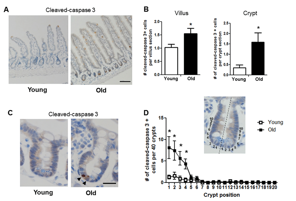 Given the age-associated IESC dysfunction indicated by our results in the ex vivo enteroid culture system, we tested whether apoptosis was increased in the small intestinal crypt of old vs. young mice. Cleaved caspase-3 immunohistochemistry revealed a significant increase in the number of apoptotic cells per crypt section in old vs. young (Figure 6A, 6B-right and 6C). The location of cleaved caspase-3 positive cells within the crypt was assessed by dividing the crypt in half lengthwise and counting the position of apoptotic cells from the base of the crypt (Figure 6D). Most apoptotic cells in old animals were at the base of the crypt in positions 1-4 (Figure 6C and 6D), indicating preferential increases in apoptosis within the IESC zone. Old mice showed a significant increase in cleaved caspase-3 positive cells in the villi (Figure 6A and 6B-left), that were strikingly located along the villus epithelium rather than the villus tip.