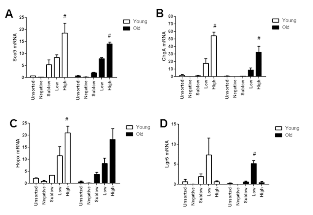 Prior studies in rodent models suggest that aging may be associated expansion of IESC or progenitor cells, but with reduced capacity for tissue repair following injury [19–22]. However, the direct effects of aging on IESC could not be examined in these studies due to a lack of IESC specific biomarkers to permit direct IESC visualization, isolation and functional analyses. The identification of specific biomarkers of IESC such as Lgr5 [23] and the development of fluorescent IESC reporter mice allow direct IESC evaluation in vivo and IESC isolation for ex vivo studies and molecular analyses [9]. Sox9-EGFP reporter mice provide a useful model because distinct levels of enhanced green fluorescent protein (EGFP) expression mark different intestinal epithelial cell (IEC) populations [24,25]. Sox9-EGFPHigh cells are hormone-producing EEC and cells with functional characteristics of activatable, reserve IESC [25,26]. Sox9-EGFPLow cells are active IESC also termed crypt based columnar cells (CBC) [23,27]. Sox9-EGFPLow cells have been functionally validated as IESC based on the ability of single Sox9-EGFPLow cells to form enteroids in vitro when isolated from uninjured small intestine [24,25,28]. Sox9-EGFPLow cells are enriched for Lgr5 mRNA and many other mRNAs expressed at high levels in Lgr5-expressing IESC-CBC [25,29]. Sox9-EGFPSublow cells are rapidly dividing progenitor cells that give rise to differentiated progeny [24,25]. Sox9-EGFPNegative cells contain differentiated IEC, particularly absorptive enterocytes, Paneth cells and goblet cells [25], based on histologic analysis and high level expression of biomarkers of these cell types.
