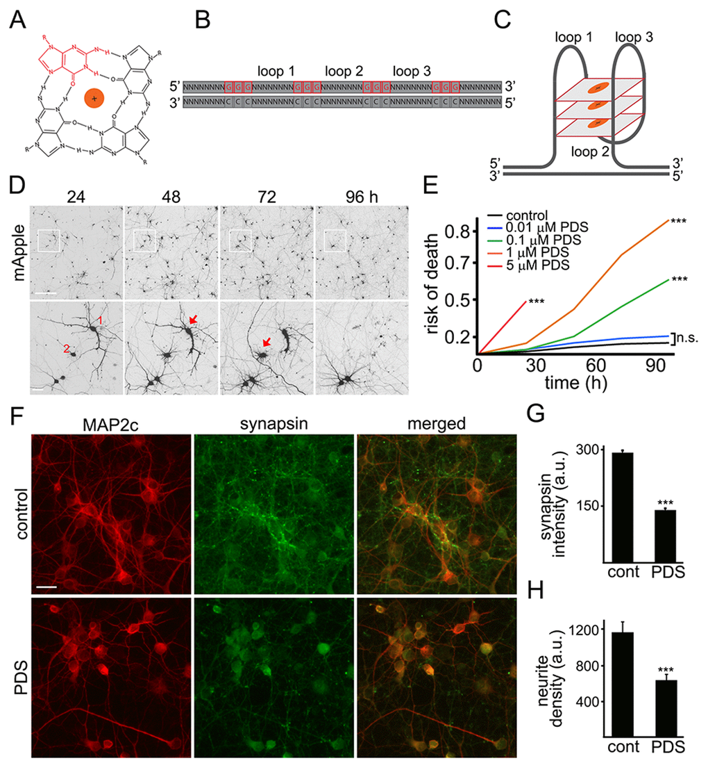 The G-quadruplex is a tetra-stranded secondary DNA structure formed by four stretches of guanines (Fig. 1A-C) [6]. Pyridostatin is a very selective G-quadruplex DNA-binding small molecule designed to form a complex with and stabilize G-quadruplex structures [9,18,19]. For cell lines, the drug is cytotoxic, and we, therefore, hypothesized that pyridostatin may be toxic for primary neurons as well. To test this, primary rat cortical cultures were transfected with the mApple construct (a red fluorescent protein). Pyridostatin or vehicle was added, and the mApple-expressing neurons were tracked for several days with an automated microscope. Loss of the red mApple fluorescence is a sensitive marker of neuronal death [20]. This method allows us to track large cohorts of individual neurons over their lifetimes and to sensitively measure their survival with statistical analyses used in clinical medicine [20]. Analyzing when each neuron lost its fluorescence allows us to measure neuronal survival with cumulative hazard statistics. By following neurons over their lifetimes, we can determine if the applied drug contributes positively, negatively, or even neutrally to neuronal fate (Fig. 1D). We found that treatment with pyridostatin substantially increased the risk of neuronal death in a dose-dependent manner (Fig. 1E). Notably, neurons exposed to pyridostatin retracted neurites before death (Fig. 1D), mimicking neurodegenerative processes commonly observed in neurons that express α-synuclein, mutant LRRK2 or mutant huntingtin [21,22].