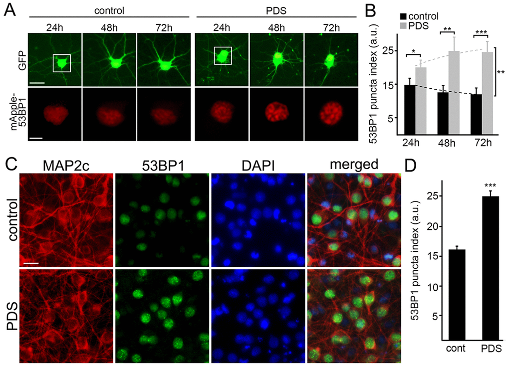 Since overexpressed proteins sometimes aggregate in primary neurons, we decided to confirm our finding with the endogenous 53BP1 protein. Cultured neurons were treated with pyridostatin, fixed and stained for endogenous 53BP1 and MAP2c, and with the nuclear DAPI dye. Neurons exposed to pyridostatin had punctuated structures of 53BP1 localized to their nuclei (Fig. 2C,D).