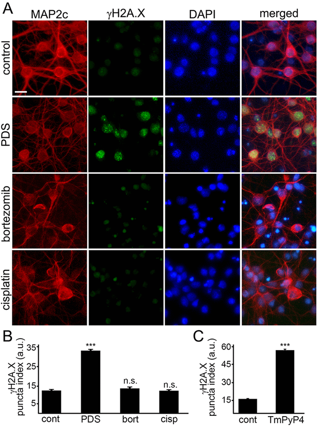 Since DNA damage may, in principle, be a general phenomenon in degenerating neurons, we determined if other neurotoxic small molecules, bortezomib and cisplatin, promote DNA DSBs. Bortezomib, a chemotherapy drug that inhibits the ubiquitin-proteasome system (UPS), was used to promote neurodegeneration. Inhibitors of the UPS are highly neurotoxic [27]. Cisplatin, another anti-tumor agent, cross links DNA and, therefore, promotes cytotoxicity [28]. Cisplatin is also highly toxic for neurons [29]. Primary neurons were treated with bortezomib and cisplatin, and then fixed and stained for γH2A.X and MAP2c. Neither bortezomib nor cisplatin induced DNA DSBs (Fig. 3А,B). Our data demonstrate that DNA DSBs are not a general effect induced by cytotoxic agents, and pyridostatin-associated DNA damage likely depends on pyridostatin’s G-quadruplex-stabilizing properties.