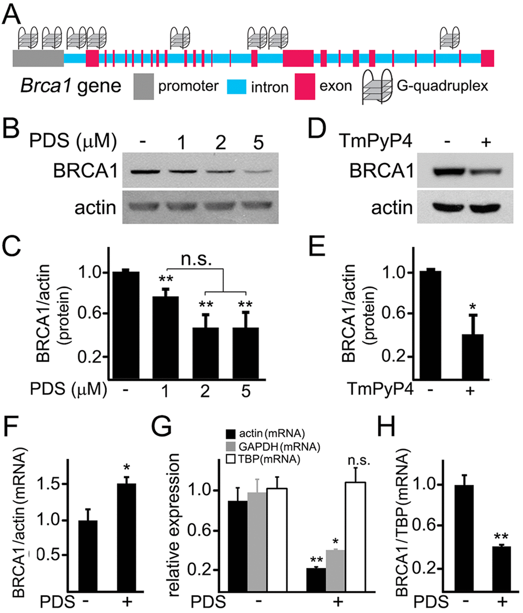 We were surprised that pyridostatin downregulated BRCA1, actin, and GAPDH, but not TBP mRNAs. We, therefore, analyzed the sequences of the Actin, Gapdh and Tbp genes and their promoters with the QGRP mapper. Both Actin’s and Gapdh’s promoters contain two putative G-quadruplex-forming sequences, and Actin contains one putative G-quadruplex sequence. Remarkably, neither Tbp nor its promoter contains a putative G-quadruplex-forming sequence, indicating that our data generated with pyridostatin are physiologically relevant. Future studies will identify more genes regulated by the G-quadruplex.