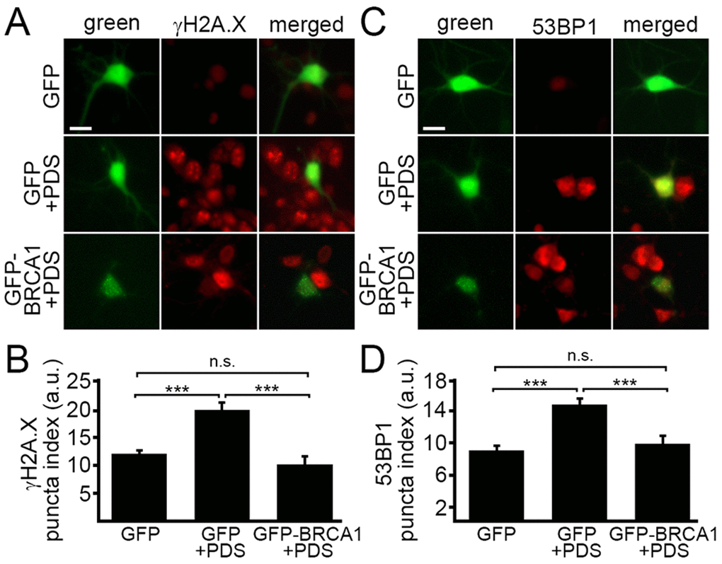 BRCA1 is required for DNA damage repair. We wondered if ectopically increasing BRCA1 protein levels would attenuate DNA damage associated with the exposure to pyridostatin. To test this, neurons were transfected with a plasmid that encodes GFP or GFP-BRCA1. Neurons were treated with a vehicle or with pyridostatin overnight and then fixed and immunostained with antibodies against γH2A.X or 53BP1 (Fig. 5A–D). The γH2A.X and 53BP1 puncta indexes in GFP-BRCA1-expressing neurons treated with pyridostatin were lower than in GFP-expressing neurons exposed to pyridostatin (Fig 5A–D). These results indicate that ectopically expressed BRCA1 mitigates DNA damage induced by pyridostatin treatment in neurons and demonstrate that BRCA1 is critical for maintaining neuronal genome integrity.