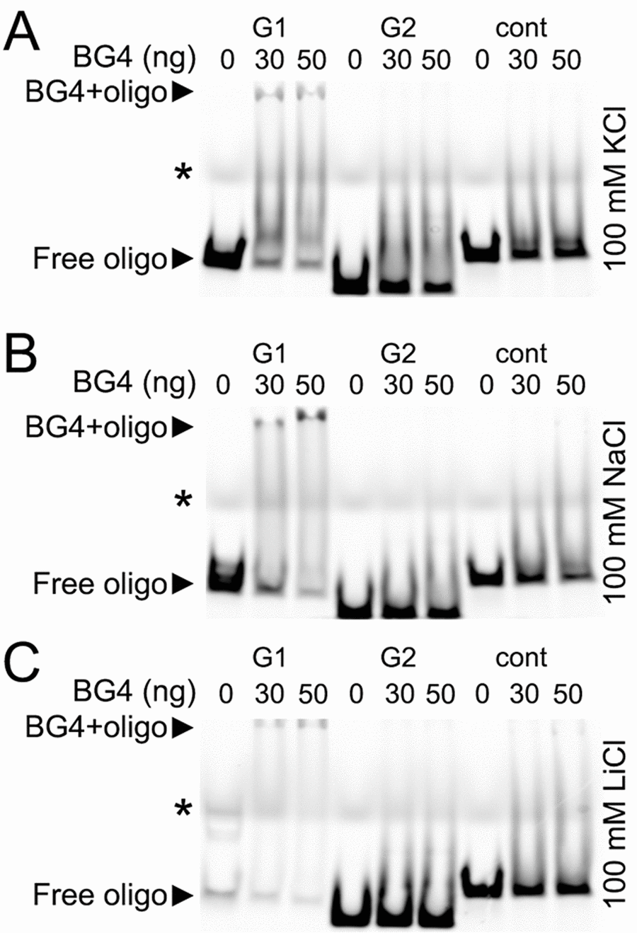 The G-quadruplexes form a stable structure in the presence of K+ and Na+ ions and do not properly fold into a G-quadruplex in a buffer that contains Li+ [33]. We incubated the BG4 antibody with the BRCA1-G1 oligonucleotide, the BRCA1-G2 oligonucleotide, and the BRCA1-cont oligonucleotide in the buffers that contained K+, Na+, or Li+ ions (Fig. 6A–C). The BG4 antibody did not form a complex with the BRCA1-cont oligonucleotide in all conditions tested (Fig. 6A–C). The BRCA1-G2 oligonucleotide also did not form a complex with the BG4 antibody. However, the BG4 antibody did bind to the BRCA1-G1 oligonucleotide, which was reflected by the slower migrating band on the gel, in both K+ and Na+ buffers. In the presence of Li+, the BRCA1-G1 oligonucleotide formed a weaker complex with the BG4 antibody (Fig. 6A–C).