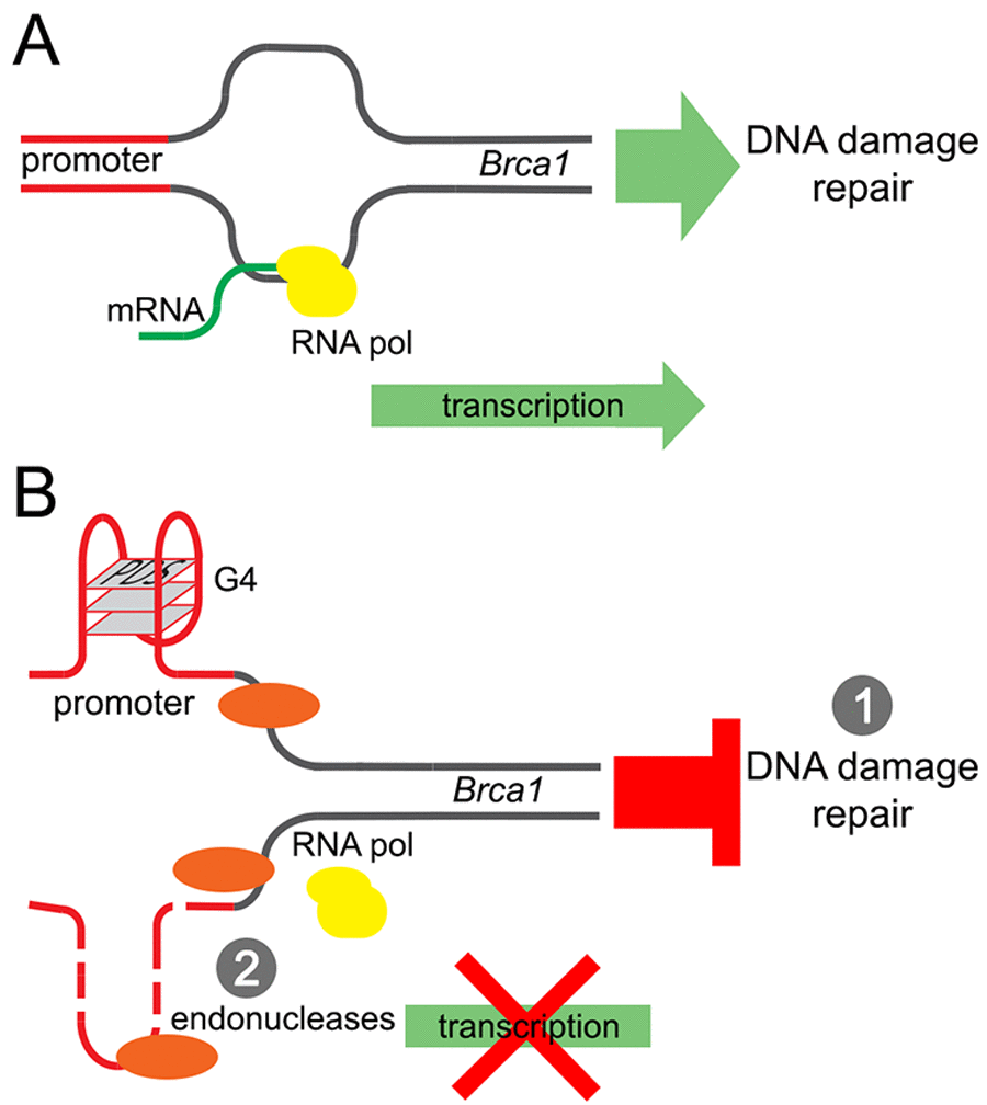 The Brca1 gene in Rattus norvegicus is a long gene that has two known alternatively spliced RNA products. We hypothesized that the Brca1 gene may contain putative G-quadruplexes. We analyzed the rat Brca1 gene sequence with the QGRP (putative quadruplex forming G-rich sequences) mapper and discovered that, in the gene, two putative sequences in the coding sequence can arrange into the G-quadruplexes. Additionally, its introns contain four putative G-quadruplex-forming sequences. There are also two putative G-quadruplex-forming sequences in the Brca1 gene promoter (Fig. 4A). Therefore, pyridostatin may stabilize these putative G-quadruplexes and inhibit the Brca1 gene transcription.