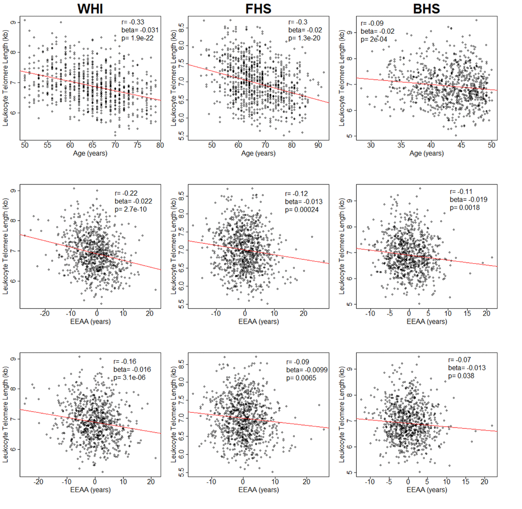 Finally, we performed two additional sets of analyses to ascertain that the correlation between LTL and EAAA arises from correlation between LTL and CD8 + T cells. First, we adjusted for the proportions naïve CD8+ T cells, memory CD8+ cells and plasmablasts. This led to non-significant correlations between LTL and EEAA in all cohorts (WHI: r = -0.04, p = 0.28; FHS: r = 0, p = 0.99; BHS: r = 0.04, p = 0.31). Second, we also examined EEAA using another set of CpG sites, described by Horvath [14]. This latter measure of EEAA showed similar associations in WHI (r = -0.18, p = 1.9 x 10-7) and FHS (r = -0.11, p = 1.1 x 10-3) but was not significant in BHS (r = -0.03, p = 0.36).