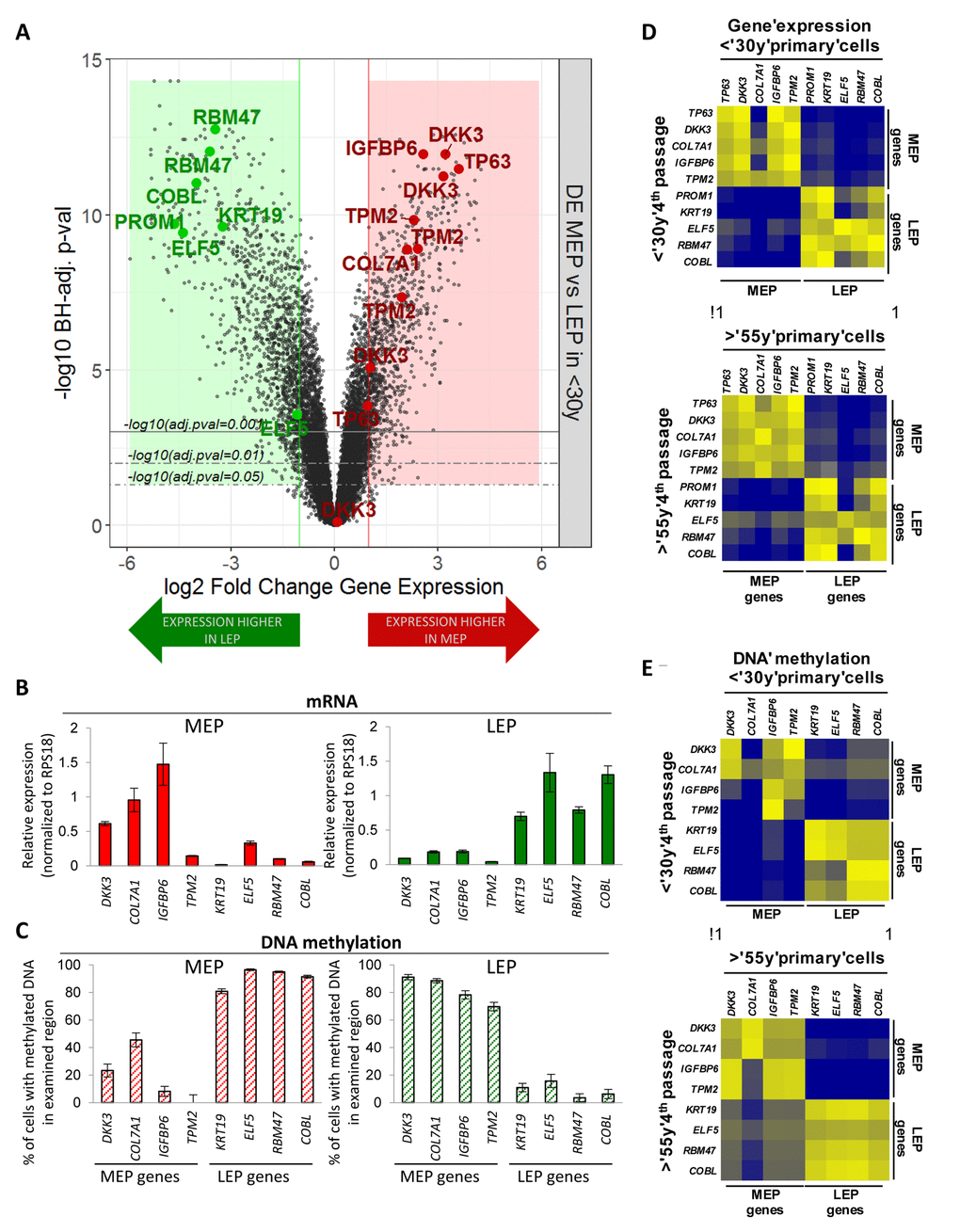 Transcriptome-wide differential expression analysis (Illumina HumanHT-12 v4 BeadChips Set 1, n=24,965 gene probes, m=19,499 mapped genes) of FACS-enriched CD10+/CD227- MEP and CD10-/CD227+ LEP from 4 different HMEC strains were used to identify lineage specific genes. Genes selected for use as probes showed >3-fold differential expression (DE) between LEP and MEP from women <30y (Benjamini-Hochberg, BH, adj. p-val < 0.05) (Fig. 1A) while also having CpG islands in their 5’ region within 5kb of the ATG start codon. These genes did not exhibit culture adaptive expression changes. Probe sets were designed to facilitate qPCR analyses of gene expression and promoter methylation of DNA by McrBC methylation sensitive enzyme digestion. DKK3, COL7A1, IGFBP6 and TMP2 were selected as MEP marker genes, and KRT19, ELF5, RBM47 and COBL were selected as LEP marker genes. These genes showed lineage-specific expression (Fig. 1B) that was inversely correlated with promoter DNA methylation (Fig. 1C) in LEP and MEP from eight different women <30y, suggesting that transcription of these genes was at least partly regulated by DNA methylation. The LEP and MEP markers PROM1 and TP63, respectively, also were used as well-known mammary epithelial lineage markers that do not appear to be controlled by methylation in CpG islands within 5kb of the start codons. The probe sets showed excellent correlation between 4p HMEC and FACS-enriched LEP and MEP from uncultured human mammary epithelial organoids, both in terms of lineage-specific gene expression (Fig. 1D, r2=0.96) and DNA methylation (Fig. 1E, r2=0.93). Results from the probe-based assays were comparable to the methylation and expression data from uncultured mammary epithelia in the NIH Roadmap Epigenomics Project (Fig. S1) [19]. Thus these lineage-specific probe sets were validated both with in vivo samples and in publicly available data.