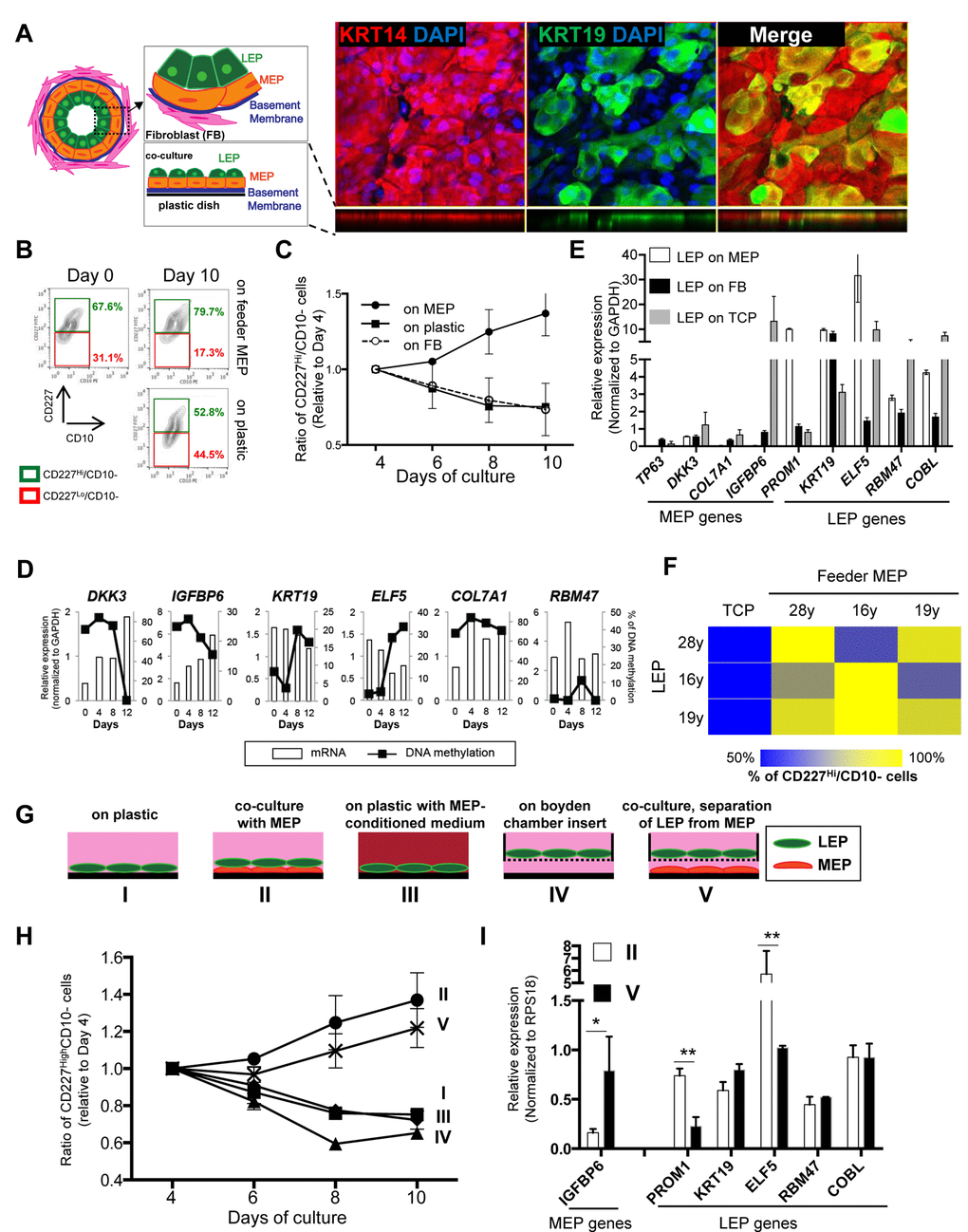 To understand what type of physical interactions between LEP and MEP were required, LEP were cultured in a number of defined conditions. LEP from a 19y woman were cultured on (I) plastic, (II) co-cultured with isogenic MEP, (III) plastic with MEP-conditioned medium, (IV) mono-cultured with LEP attached to Boyden chamber inserts or (V) co-cultured with isogenic MEP in which LEP were physically separated by a Boyden chamber insert (Fig. 2G). CD227 and CD10 expression was monitored every two days by FACS (Fig. 2H). Co-cultures II and V, regardless of direct or no-direct contact of LEP with MEP, showed increased proportions of CD227+ cells over time, whereas LEP declined in mono-culture conditions (I, III and IV) (Fig. 2H). Although the CD227+ cells population increased in both co-culture conditions II and V, the no-direct contact co-culture (V) showed reduced expression of PROM1 and ELF5 and increased IGFBP6 expression compared to direct cell-cell contact (II)(Fig. 2I), suggesting that only a partial LEP phenotype was maintained in co-cultures where MEP and LEP were physically separated (in this case by 900 μm). These experiments revealed that TCP does not provide an optimal microenvironment for maintaining the LEP phenotype even in presence of MEP-conditioned media. Indeed, LEP on TCP are eventually reprogrammed to more MEP-like states, and senesce more quickly than MEP (not shown), which serves as an extreme example of how microenvironment can negatively impact the LEP phenotype. These data show that direct LEP-MEP contact provided crucial microenvironment components for maintenance of the LEP phenotype. That stromal fibroblasts – a cell type that is ostensibly at least one cell-diameter removed from LEP in vivo, did not provide a satisfactory microenvironment for maintenance of LEP underscores the specificity of the LEP-MEP interactions for maintaining the LEP phenotype.