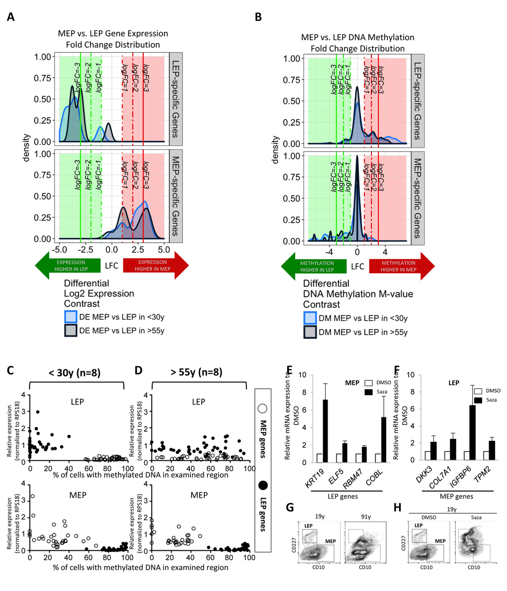 Differential methylation (DM) analysis of M-values (the log2 ratio of methylated to unmethylated probes) at CpG sites associated with the probeset genes (n=247 Illumina CpG sites) revealed a gross inverse relationship between expression and DNA methylation; LEP-specific genes had higher methylation levels at these loci in MEP, and vice versa (Fig. 3B). The distribution of fold changes in methylation decreases in magnitude of lineage-specific differences in the >55y group compared to the <30y group (Fig. 3B). The effect of age is most evident in the LEP-specific probeset genes. Viewing the methylation architecture of these probeset genes at the resolution of annotated gene regions, we find age-dependent changes in methylation mainly occur in the genes’ regulatory regions, e.g. transcription start sites (TSS), 5’-untranslated region (UTR), and some in the 1st exon (Fig. S2A).
