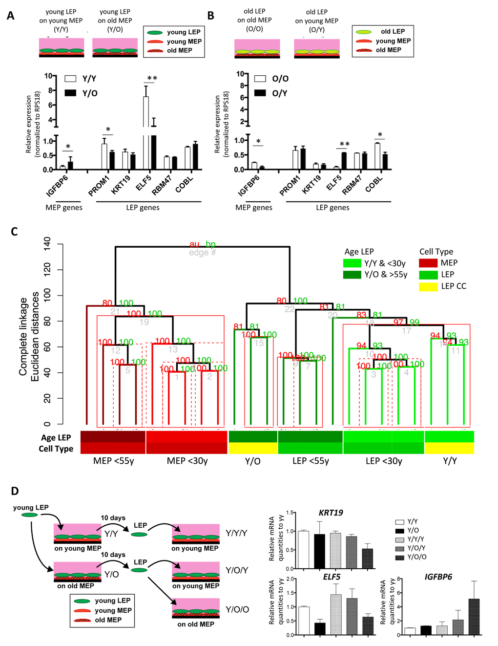 Gene expression and DNA methylation of ten LEP and ten MEP samples from nine individuals (four young subjects <30 years old, five older subjects > 55 years old) were analyzed across two Illumina HumanHT-12 v4 Expression (Set 1) and two Infinium 450K Methylation BeadChip arrays. BeadChips were designed to have balanced, well-stratified distribution of samples for factors of interest (cell type and subject age) with one reference individual (240L MEP and LEP samples, <30 years old) shared between the two chips. Additionally, gene expression from six LEP co-culture samples (three biological replicates of 240L <30y LEP co-cultured on 240L <30y MEP, and three biological replicates 240L <30y LEP co-cultured on 122L >55y MEP) along with 18 samples of 4p LEP and MEP isogenic to the co-culture MEPs (five biological replicates of 240L <30y LEP and MEP, and four biological replicates 122L >55y LEP and MEP) distributed evenly across five Illumina HumanHT-12 v4 Expression (Set 2) were also analyzed.