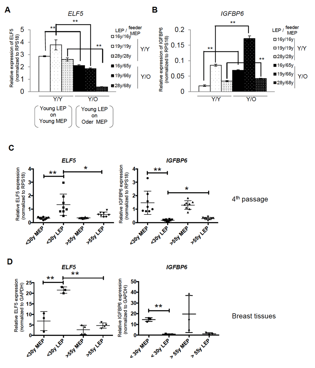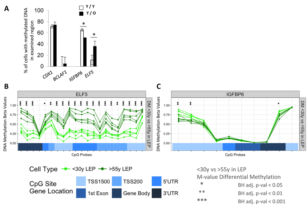 We next determined if exposure of LEP to the different aged MEP was also associated with changes in DNA methylation in the promoter regions. ELF5 and IGFBP6 were the focus of these experiments because age-dependent changes in expression were reliably linked to changes in promoter methylation. DNA methylation was examined in young LEP co-cultured with young (Y/Y) or old (Y/O) MEP for 10 days. CDX1 and BCLAF1 were used as hyper- and hypo-methylation control genes, respectively, which did not change in any of our co-culture conditions (Fig. 6A). DNA methylation in LEP in the regulatory regions of ELF5 increased 30±9% in Y/O cultures and methylation at the IGFBP6 promoter decreased 13±0.7% compared to Y/Y (Fig. 6A). These changes in methylation measured with McrBC digests in co-culture were consistent with age-dependent changes in ELF5- and IGFBP6- DNA methylation at the gene regulatory regions (Infinium Human Methylation 450K BeadChip) of <30y vs. >55y FACS enriched 4p LEP (Figure 6B-6C). In 4p LEP, differences in corresponding methylation beta-values, which measure percentage of methylation, show large age-specific increase in methylation levels in ELF5 across numerous CpG sites in the gene regulatory region from hypo-methylated (β-val < 0.25) in <30y LEP to hemi- (0.25 < β-val < 0.75) and hyper-methylated (β-val > 0.75) in >55y LEP. Furthermore, these changes in ELF5 methylation levels in >55y LEP shift towards more MEP-like methylation levels (compare Fig. 6B, Fig. S3A), showing loss of lineage-specific methylation with age. A smaller, though significant, decrease in methylation levels in IGFPB6 regulatory region is observed with hyper-methylated sites in <30y LEP becoming hemi-methylated in >55y LEP (compare Fig. 6C, Fig. S3B). These differentially methylated regulatory regions in ELF5 and IGFBP6 correspond to either annotated enhancer element regions or DNaseI hypersensitivity sites, suggesting that transition between hypo-, hemi- and hyper-metylation states in these regions could have a significant effect on transcription levels (Fig. SA and SB). Differential methylation between <30y and >55y 4p LEP for the remaining probeset genes are shown in Fig. S4A-S4F.