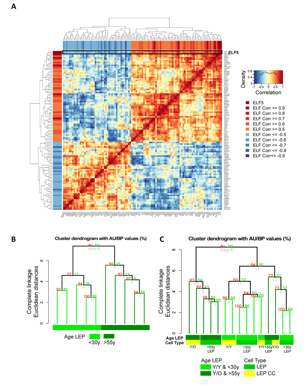 Methylation of the promoters should facilitate stabilization of microenvironment-imposed gene expression. Furthermore, when the regulated gene product is a lineage-specific transcription factor, we should be able to measure changes in downstream gene networks. As a transcription factor, ELF5 warranted further examination and we asked whether age-related decline of ELF5 alters expression of target genes. ELF5 target genes were previously identified by ELF5-ChIP in the breast cell line T47D (499 probes, 429 unique genes at FDR < 0.05, t = 48HR) [21]. Of this ELF5-ChIP gene set, 323 of the prospective ELF5-target genes were in our Illumina HumanHT-12 v4 BeadChips (Set 1) corresponding to 528 gene probes. Gene-gene correlation analysis showed 92 target genes corresponding to 105 gene probes to be correlated or anti-correlated with ELF5 expression in 4p LEP from 9 different HMEC strains from both <30y and >55y age groups (absolute correlation ≥ 0.5, Figure 7A). Pre-stasis 4p LEP clustered according to age based on ELF5 and ELF5-target gene expression (Figure 7B). Furthermore, young LEP co-cultured with young MEP (Y/Y) clustered with <30y while two out of three young LEP co-cultured with old MEP (Y/O) clustered with a majority of >55y LEP (Figure 7C). This suggests that age-related changes in ELF5 expression impact known target genes downstream of ELF5 in LEP in an age-dependent manner, and that these changes can be driven by cues from the MEP microenvironment. Taken together, these data converge on the conclusion that the age of MEP-generated microenvironments is a determinant of promoter DNA methylation states, which may drive, and stabilize some of the age-related gene expression phenotypes in LEP.