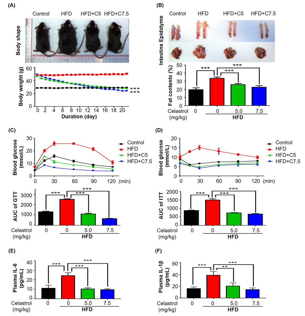 To evaluate the in vivo effects of celastrol on the release of pro-inflammation cytokines, mouse plasma was collected from mice in four treatment groups (i.e., Control, HFD, HFD+C5, HFD+C7.5). The plasma levels of IL-6, TNF-α and IL-1β were determined by enzyme-linked immunosorbent assay (ELISA) kits. As shown in Fig. 1E and 1F, HFD increased the plasma levels of IL-6 and IL-1β while celastrol effectively reduced the plasma levels of IL-6 and IL-1β to the normal levels in a dose-dependent manner. No signals were detected for TNF-α in mouse plasma.