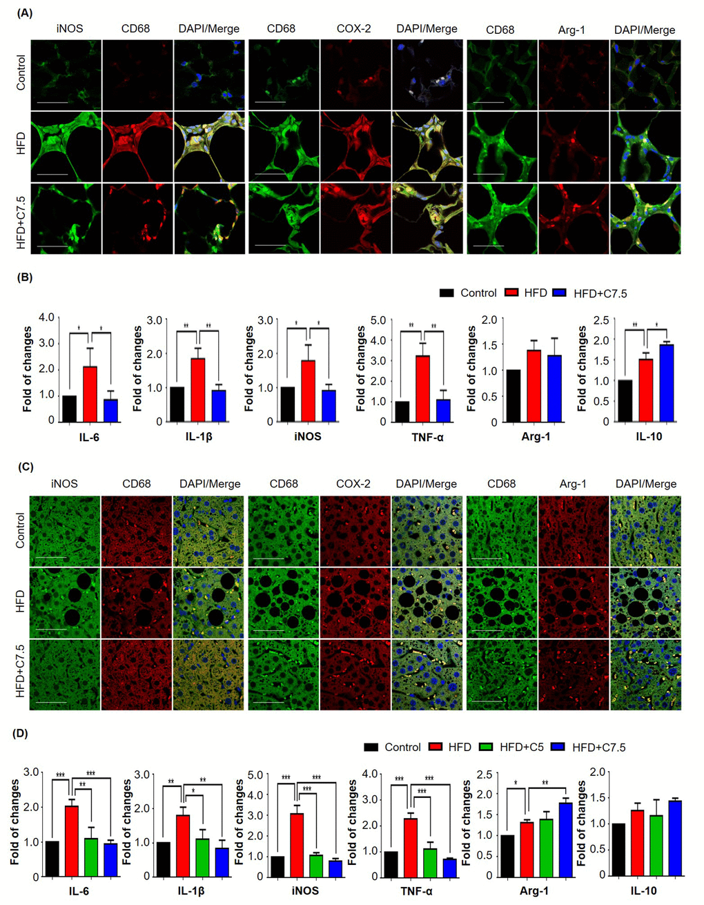 To determine the in vivo effects of celastrol on macrophage polarization, mouse epididymal fat pads and livers were recovered from animals in three treatment groups (i.e., Control, HFD, HFD+C7.5), and subsequently examined the expression of the typical biomarkers for inflammation and macrophage polarization by immunostaining and qRT-PCR techniques. For adipose tissues, as shown in Fig. 2A, epididymal fat pads were stained with antibodies against inducible nitric oxide synthase (iNOS), cyclooxygenase-2 (COX-2) and arginase-1, whereas CD68 was stained as a pan macrophage biomarker, and DAPI as a probe for cell nuclei. HFD increased the expression of iNOS and COX-2 in macrophages, while celastrol selectively reduced the expression of iNOS over COX-2. Interestingly, celastrol somehow enhanced the expression of arginase-1 in macrophages. To further examine the effects of celastrol on macrophage M1/M2 polarization in adipose tissues, we determined the expression levels of the typical macrophage biomarkers by qRT-PCR. As shown in Fig. 2B, HFD elevated the mRNA levels of several pro-inflammatory biomarkers, whereas celastrol diminished the mRNA expression of pro-inflammatory genes including IL-6, IL-1β, TNF-α and iNOS, and also marginally increased the mRNA level of IL-10 over arginase-1. On the other hand, hepatic tissues were stained with antibodies against iNOS, COX-2 and arginase-1, whereas hepatic macrophages were stained with anti-CD68 antibody and the cell nuclei were stained with DAPI. As shown in Fig. 2C, HFD increased the expression of iNOS and COX-2 in hepatic macrophages, whereas celastrol treatment selectively reduced iNOS expression over COX-2. Interestingly, celastrol enhanced arginase-1 expression in hepatic macrophages. Furthermore, the expression of inflammation and macrophage biomarkers was determined by qRT-PCR technique. As shown in Fig. 2D, qRT-PCR revealed that HFD generally increased the mRNA expression of selected biomarkers for inflammation and macrophage polarization. However, celastrol at the dose of 7.5 mg/kg/d effectively reduced the mRNA expression of pro-inflammatory genes including IL-6, IL-1β, TNF-α and iNOS back to the normal levels or even lower levels, while upregulated the expression level of arginase-1 mRNA and to a lesser extent, IL-10 mRNA.