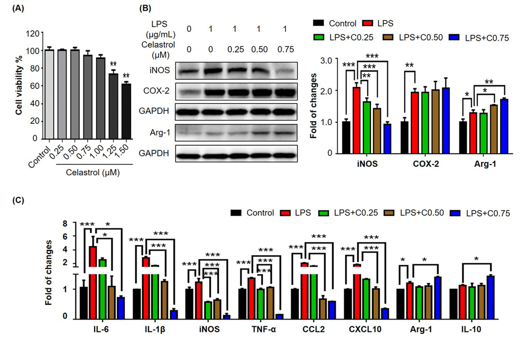 To clarify whether celastrol targets macrophages, we examined the effects of celastrol on the expression of selected biomarkers in mouse macrophage cell line RAW264.7. We firstly evaluated the effect of celastrol on the cell viability in RAW264.7 cells over a period of 48 h. As shown in Fig. 3A, celastrol could exhibit detectable cytotoxicity when the concentration was raised up to 1.25 μM (p < 0.01). Celastrol eventually exhibited the IC50 value of 1.69 μM against the growth of RAW264.7 cells. We thereby treated RAW264.7 cells with celastrol at the concentrations below 1.25 μM for other experiments. We subsequently investigated the effects of celastrol on the expression of iNOS, COX-2 and arginase-1 by Western blot analysis. RAW264.7 cells were pre-treated with celastrol for 1 h and challenged with LPS for another 24 h. As shown in Fig. 3B, celastrol remarkably attenuated LPS-induced iNOS expression (p < 0.001), effectively up-regulated arginase-1 expression (p < 0.01) in a concentration-dependent manner. Unexpectedly, celastrol appeared to potentiate LPS-induced COX-2 expression. We further investigated the effects of celastrol on the mRNA expression of several key pro-inflammatory M1 and anti-inflammatory M2 biomarkers by qRT-PCR technique. As shown in Fig. 3C, LPS profoundly up-regulated six common M1 macrophage biomarkers while showed less effects on the expression of M2 macrophage biomarkers arginase-1 and IL-10. Celastrol not only suppressed LPS-induced expression of M1 macrophage biomarkers including IL-6, IL-1β, iNOS, TNF-α, CCL2 and CXCL-10 in a concentration-dependent manner, but also upregulated the mRNA expression of M2 macrophage biomarkers arginase-1 and IL-10 (p < 0.05) when the concentration was raised to 0.75 μM.