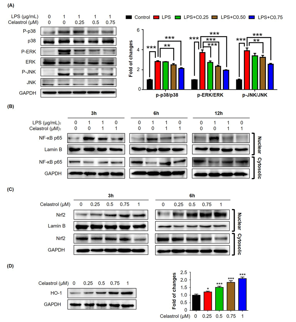 To further investigate the effects of celastrol on pro-inflammatory NF-κB pathway and antioxidant Nrf2/HO-1 pathway, we focused on the nuclear translocation of transcriptional factors NF-κB p65 subunit and Nrf2 and the induction of anti-oxidant enzyme HO-1. For the nuclear translocation of NF-κB p65 subunit, we pretreated the cells with 1 μM celastrol for 1 h and subsequently challenged the cells with LPS for another 3, 6 or 12 h. Nuclear and cytoplasmic proteins were prepared and analyzed by Western blot analysis. As shown in Fig. 4B, LPS profoundly increased the presence of NF-κB p65 subunit in the nuclear fractions. Cleastrol effectively attenuated the stimulatory effects of LPS on the nuclear translocation of NF-κB p65 subunit and promoted the sequestration of NF-κB p65 subunit in the cytosol in a time-dependent manner. On the other hand, for the nuclear translocation of Nrf2, we treated the cells with 0.25, 0.5, 0.75 and 1 μM celastrol for 3 or 6 h. Nuclear and cytoplasmic proteins were similarly prepared and analyzed by Western blot analysis. As shown in Fig. 4C, celastrol effectively induced the nuclear translocation of Nrf2 in a concentration- and time-dependent manner. Furthermore, we treated the cells with celastrol for 24 h and examined the expression levels of Nrf2-target gene HO-1 by Western blot analysis. As shown in Fig. 4D, celastrol indeed induced HO-1 expression in a concentration-dependent manner.