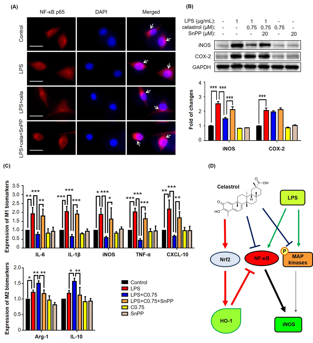 Antibodies against p38, ERK1/2, JNK, GAPDH, Lamin B, phospho-p38, phospho-ERK1/2, phospho-JNK, COX-2 were purchased from Cell Signaling Technology (Boston, MA, USA). Antibodies against arginase-1, HO-1, Nrf2 and NF-κB p65 were purchased from Santa Cruz Biotechnology (Dallas, TX, USA). Antibodies against iNOS and CD68 were purchased from Abcam (Cambridge, UK). Anti-rabbit HRP-conjugated IgG secondary antibody and lipopolysaccharide (LPS) were purchased from Sigma-Aldrich (St. Louis, MO, USA). Dulbecco’s modified Eagle’s Medium (DMEM), fetal bovine serum (FBS) and 100x penicillin and streptomycin solution were purchased from Invitrogen (Carlsbad, CA, USA). Protein assay dye reagent concentrate was purchased from Bio-Rad (Hercules, CA, USA). HO-1 inhibitor SnPP was purchased from Frontier Scientific Inc (Logan, UT, USA). Celastrol with the purity of over 98% by HPLC was purchased from Nanjing Spring and Autumn Biological Engineering Co., Ltd. (Nanjing, China).