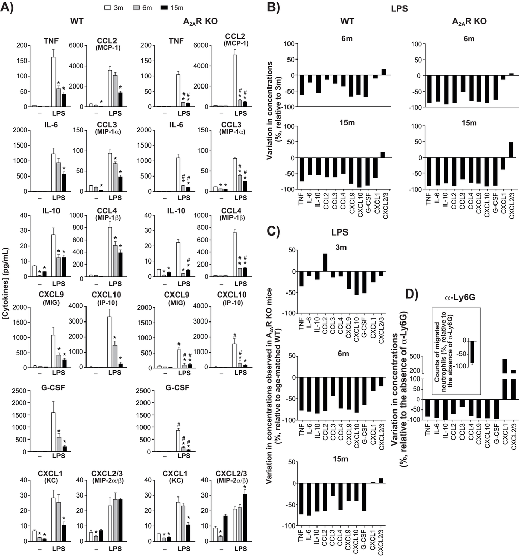 To hinder neutrophil migration to the inflammation sites, 3-month-old WT mice that were to be treated with LPS received an intravenous injection of anti-Ly6G, which works via a β2-integrin-dependent mechanism [22]. Neutrophil counts in LPS-injected pouches were thus decreased by as much as 80% (Fig. 2D, insert). Subsequent accumulation of TNF, IL-6, IL-10, CCL2-4, CXCL9-10 and G-CSF was also decreased, often by more than 75% (Fig. 2D), while levels of CXCL 1, 2 and 3 increased by 2–4 fold. Preventing neutrophil migration thus appears to replicate the effects of aging on the local accumulation of cytokines.