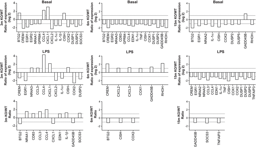 Increased expression of genes encoding transcription factors, cytokines, enzymes, regulatory elements and receptors is an additional indication of leukocyte activation [7,8]. We calculated the stimulation indexes of various genes in neutrophils as a function of age under basal and inflamed (LPS) conditions, WT and KO mice (Suppl. Figures S3, S4). Consistent with our previous observations [8], mRNA encoding the cytokines IL-1β, CXCL2, CCL 3 & 4 and phosphatase DUSP1 were among the most abundant, under basal and LPS-inflamed conditions. Messenger RNA encoding IL-1α, IL-1β, CCL 3 & 4, CXCL 2 & 3, MAPK signaling factor GADD45B and suppressor signals SOCS3 and TNFAIP3 had the highest stimulation indexes. CCL3, CCL4, CXCL1, and CXCL3 mRNA levels increased in leukocytes recovered from air-pouches of WT mice aged 6 and 15 months, under basal and LPS conditions, by more than 10-fold in the case of CCL4 (Fig. 3A & B, top and middle panels). In contrast, TNF mRNA diminished consistently. IL-1α mRNA faded under conditions of LPS stimulation. The CCL4 stimulation index increased at six months, while indexes for CXCL1 and IL-1α decreased (Fig. 3A & B, bottom panels). Increases in CXCL2 and CXCL3 and decreases in TNF under basal and LPS conditions were greater in KO than in WT mice (Figure 4A & B). Stimulation indexes of IL-1α, IL-1β, CCL3, CCL4, CXCL2, CXCL3, EDN1, and TNF were affected negatively as the animals aged. Age-matched comparisons between KO and WT revealed CCL4 expression up to 16 times higher in leukocytes recovered from dorsal air pouches of KO compared to WT mice (Fig. 5), while CXCL2 and IL-α decreased. Stimulation indexes for CCL3, CCL4 were higher. In 15-month-old mice, the vast majority of the affected genes were expressed more weakly in KO than in WT mice. A compilation of the most salient gene expression trends is presented in Table 1.