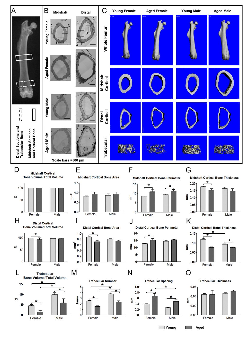 Other studies have used microCT to evaluate age related changes in bone architecture in C57BL/6 mice in males [6] or both genders [8] but have not examined both midshaft and distal cortical bone or integrated this with simultaneous analysis of the osteocyte lacunocanalicular network and histomorphometry. Our results are in agreement with these microCT studies, which report reduced trabecular BV/TV, increased cortical bone perimeter and decreased cortical thickness with more pronounced effects in females than males. In a study of PTH effects on skeletal aging in C57BL/6 mice and its effects to antagonize age-related oxidative stress, similar changes in bone architecture in the femur and vertebrae were reported in female aged mice [7].