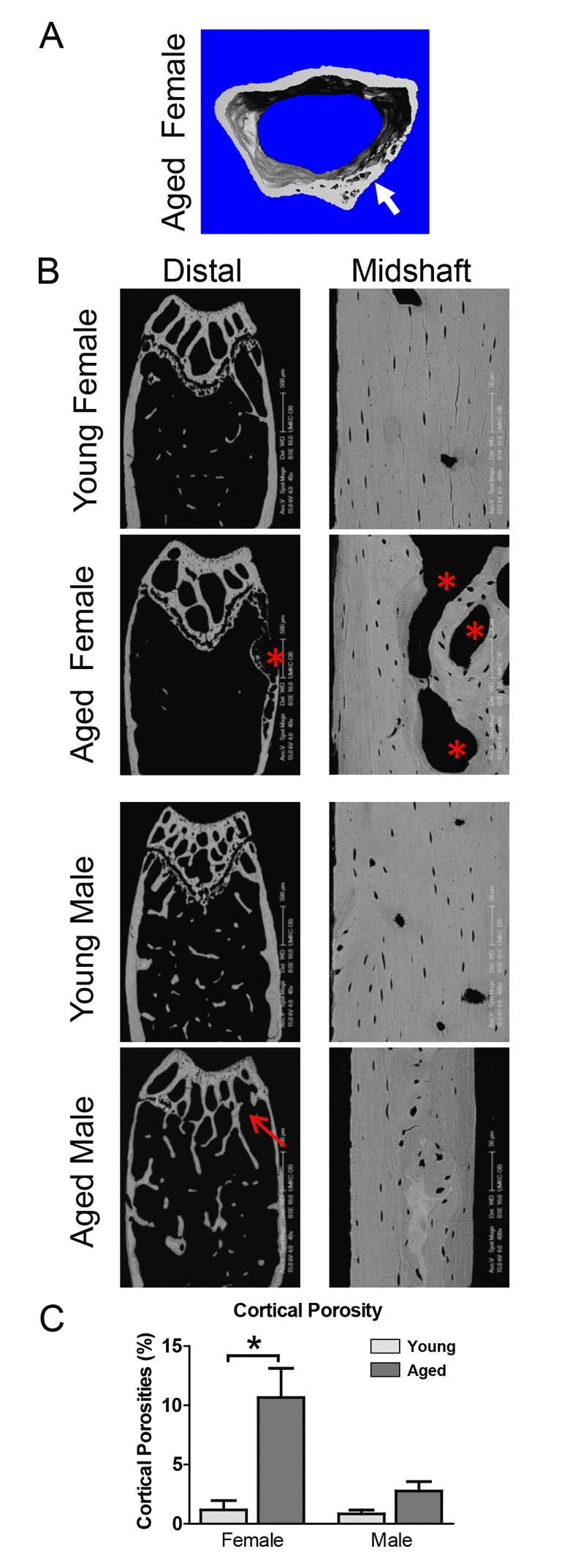 In the current study, we saw the appearance of large cortical porosities with aging, particularly in female mice. These were not reported in other microCT studies of skeletal aging in C57BL/6 [6,8]. However, cortical porosities were observed in aged female C57BL/6 mice by Jilka et al. [51]. They further showed that dysapoptosis of osteocytes by targeted deletion of BAK and BAX, two genes essential for apoptosis, increased cortical porosity suggesting that signals from old or damaged osteocytes may be responsible. These cortical porosities were preferentially localized to the endosteal region in Jilka’s study and ours and are analogous to increased cortical porosity in humans with aging [4,52]. However, in humans the porosities occur due to increased size of Haversian canals whereas mice are not thought to form Haversian bone. Histologically, the cortical porosities in our mouse model contained marrow. Mouse cortical bone has a network of blood vessels running through it [53] and it is likely that these extramedullary marrow spaces initiate around blood vessels, resembling Haversian remodeling in humans.