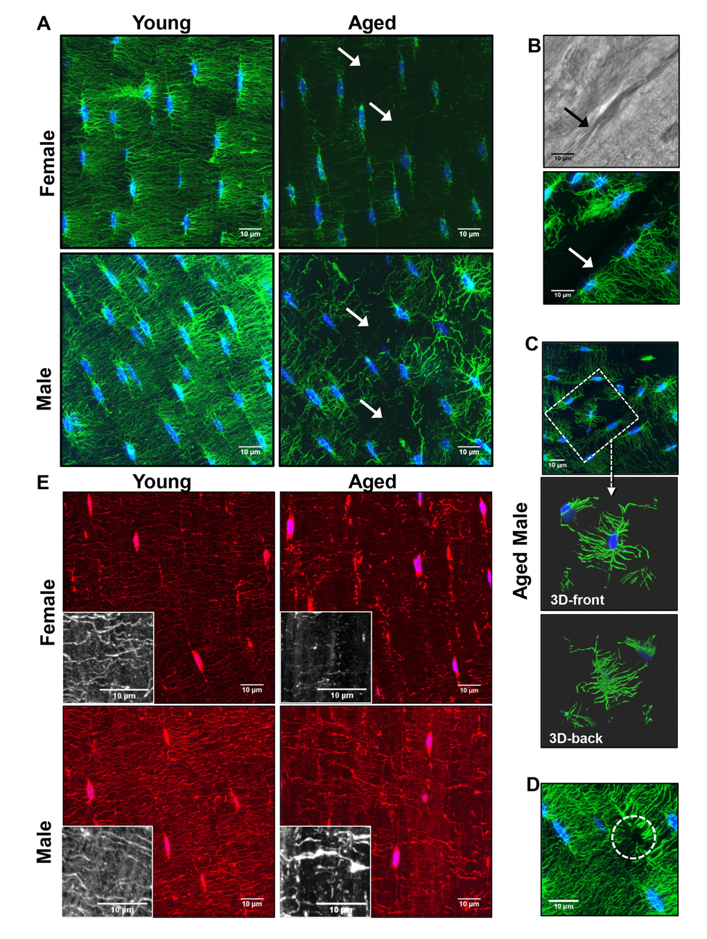 Recently, we have developed multiplexed confocal imaging methods combined with using fixable tracer dyes that allow us to simultaneously image several aspects of the osteocyte, including its cytoskeleton, nucleus, cell membrane and the LCS fluid space in 3D [35]. This has allowed us to examine alterations in the osteocyte network and dendrite connectivity directly without relying on extrapolation from imaging the LCS. Using these techniques, the aim of this study was to analyze directly for the first time the degenerative changes in osteocytes, their dendrite connectivity and their lacunar fluid space in young and aged mice and integrate these observations with age related histological and structural changes in the bones. Our data show dramatic differences in osteocyte connectivity, bone geometry and structure with aging that are gender dependent and may have important implications for mechanoresponsiveness and age related bone loss.