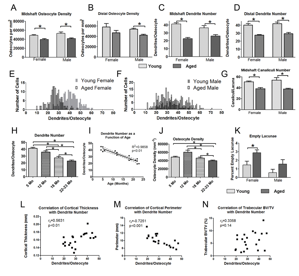 In this study, a comprehensive analysis of age related changes in bone was performed using the C57BL/6 aged mouse model. Using newly developed multiplexed 3D confocal imaging methods and fixable tracer dyes we have for the first time simultaneously imaged and quantified osteocytes and their dendrite connectivity directly, together with their lacunocanalicular networks in aged mice and correlated these with changes in bone structure and geometry analyzed by microCT and histomorphometry. Our data show that aging is associated with changes in bone structure and geometry in the femur including increased cortical diameter, decreased cortical thickness, reduced trabecular BV/TV and cortical porosities resulting in extramedullary marrow spaces. These changes are analogous to degenerative age related changes in humans [2,4,36,37] in which cortical thinning, reduced trabecular bone volume and cortical porosities are seen. These age related changes were gender specific in C57BL/6 mice, with females showing a more dramatic loss in trabecular bone and more cortical porosities compared to males and males showing closure of the growth plate with aging. The increased femoral cortical diameter with aging would lead to a greater moment of inertia in aged bones and likely represents an adaptive response to maintain bone strength in a bone with thinner cortices.