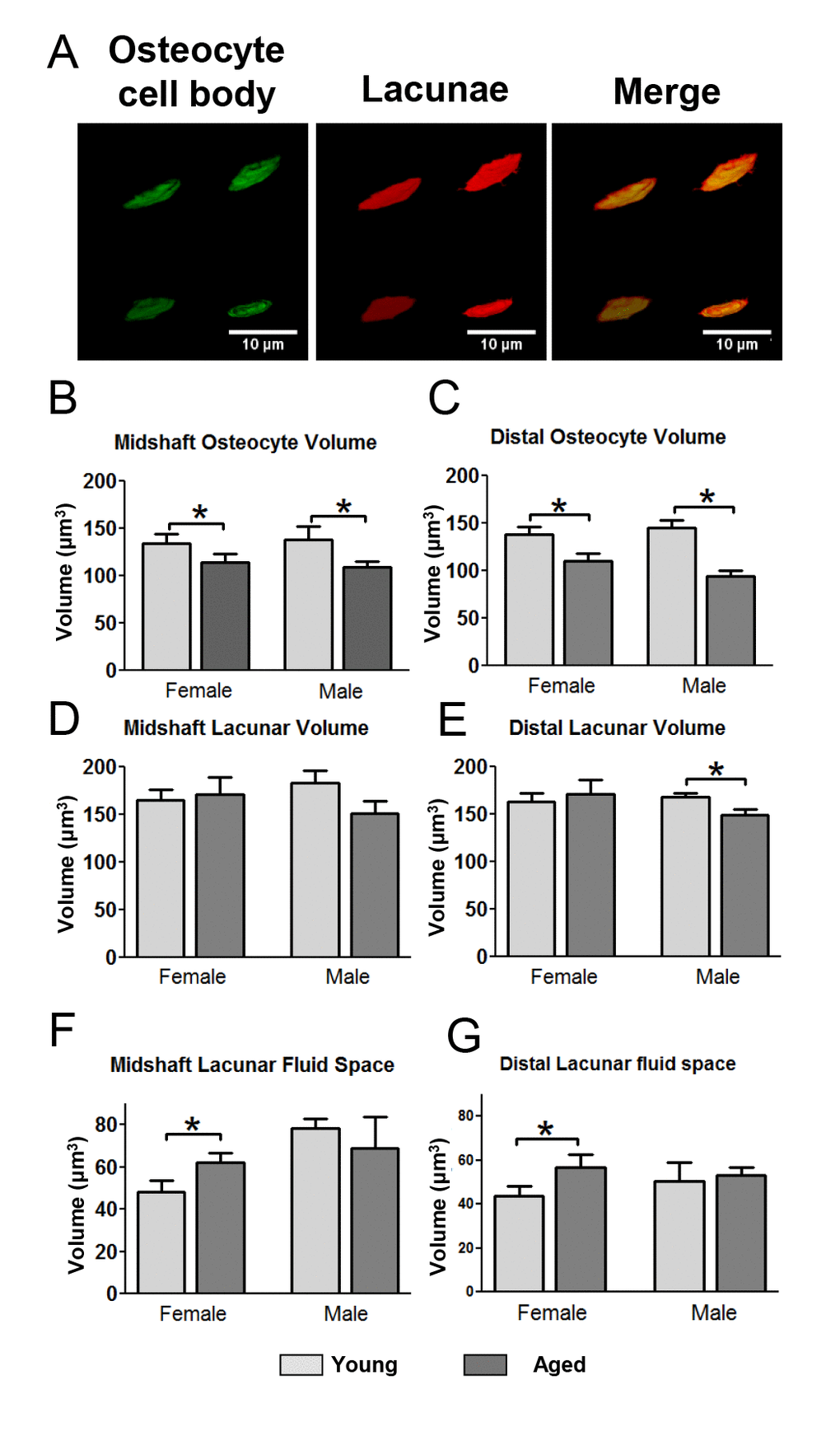 Most previous studies of osteocyte connectivity have used acid etch SEM imaging, nanoCT or synchrotron X-ray methods that image the lacunae and canaliculi but not the osteocytes themselves. Using multiplexed confocal imaging together with fixable tracer dyes we can simultaneously measure the osteocyte cell body and lacunar volume in young and aged mice, which was previously only possible by TEM. Our data suggest that female osteocytes “shrink” within their lacunae by reducing their cell body but not lacunar volume, resulting in an increased lacunocanalicular fluid volume. In contrast, male osteocytes reduced both their cell body and lacunar size with no significant change in lacunar fluid volume. These gender related differences in fluid volumes could lead to differences in mechanosensitivity, as the patterns of lacunar and canalicular fluid flow shear stress may be different in males and females. Our multiplexed confocal imaging provides a more comprehensive picture of age-related degenerative changes in osteocytes and their LCS networks and such data can now be used to create more sophisticated computational models of bone loading and the local strain environments around osteocytes as well as how this is altered with aging.