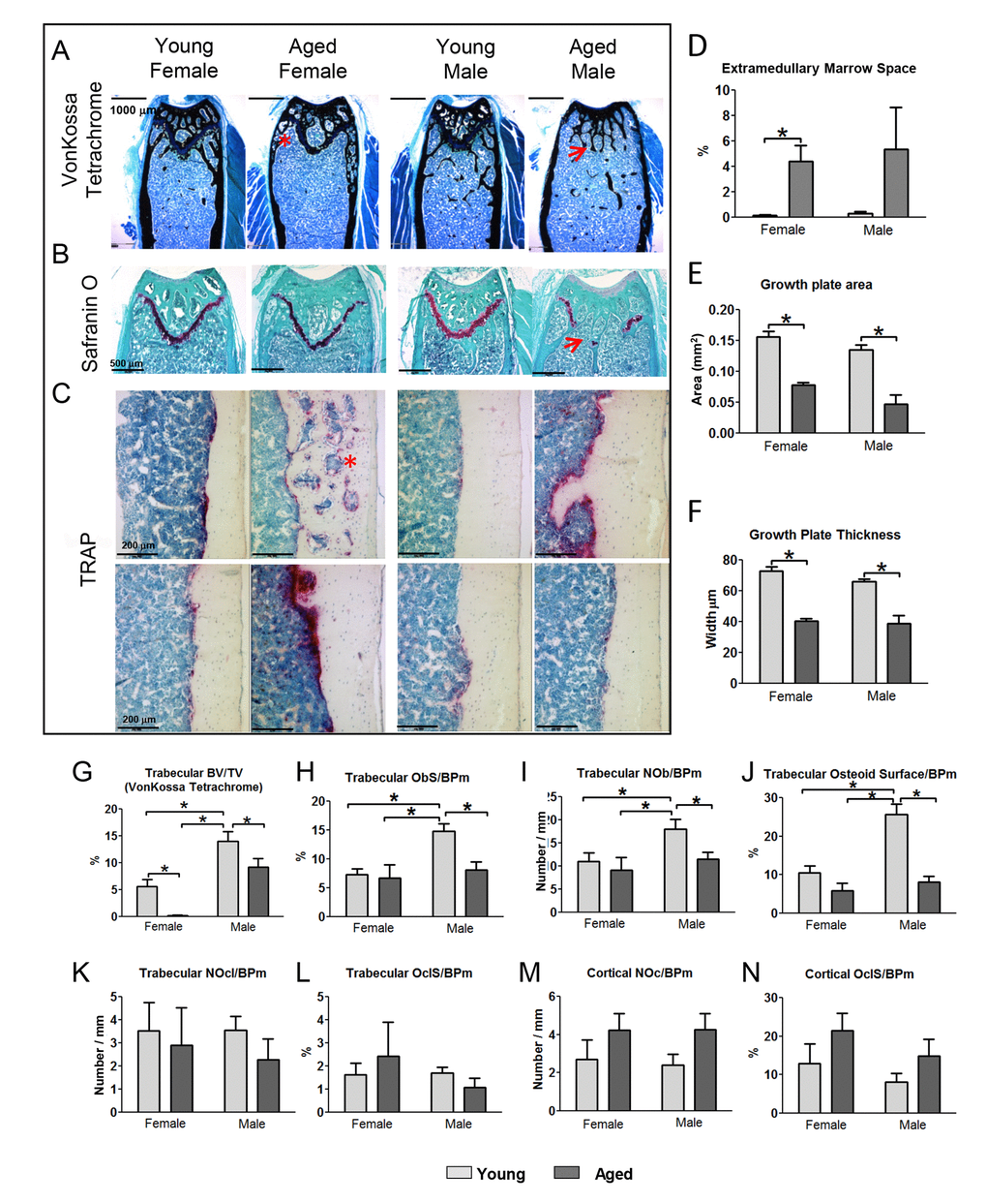 Histology reveals cortical porosities, loss of growth plate in males and altered osteoblast and osteoclast activity in aged animals